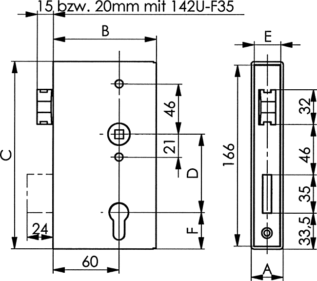 mit verzinktem Schloss Nr. 142U-**. Rechts und links verwendbar durch umdrehbaren Fallenkopf. Wahlweise vorgerichtet für Profilzylinder (PZ), Schweizer Rundzylinder (RZ) oder für Buntbart-Nachrüstsatz. Mit Wechsel.