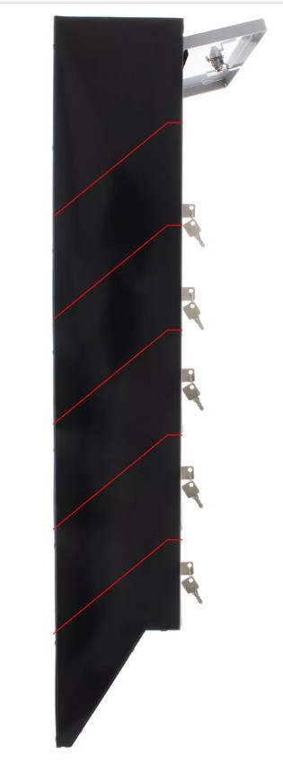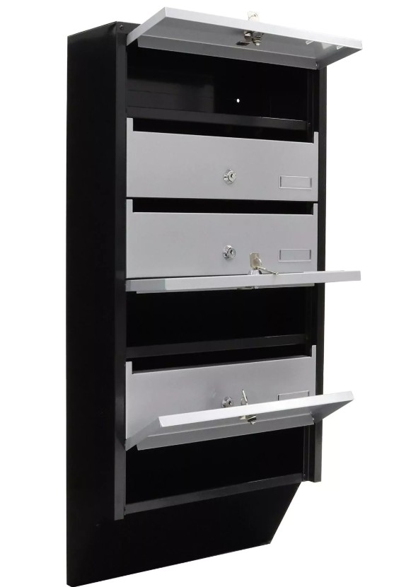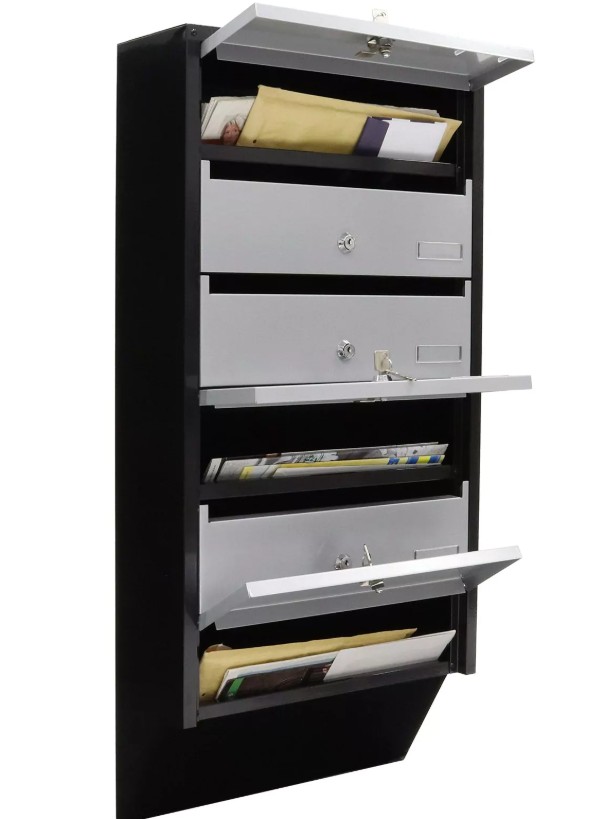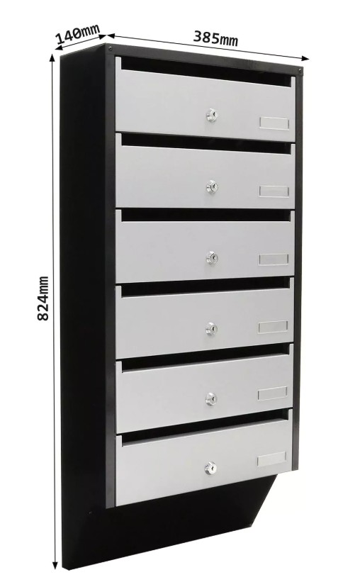 Die Briefkastenanlage DEPOT (für 4 oder 6 Parteien) besticht durch die besonders schlanke Konstruktion und durch ihre Farbgebung in Schwarz und Silber. Das Postgut bis Größe DIN C4 wird schräg nach unten im Briefkasten gelagert. Durch diese ausgeklügelte Konstruktion ist diese Anlage speziell in engen Stiegenhäusern extrem platzsparend. Eine Anlage verfügt über 4 Fächer für vier Parteien. Jedes Fach ist mit einem Kunststoff-Namensschild ausgestattet und ist mittels Zylinderschloss vor unbefugtem Zugriff geschützt. Zu jedem Fach werden zwei Schlüssel mitgeliefert. Durch die nach oben öffnenden Entnahmetüren ergibt sich der Vorteil, dass die Türe auch im nicht versperrtem Zustand immer am Korpus anliegt und nicht als gefährliches Hindernis nach vorne steht. Sie können die Anlage seitlich beliebig erweitern (Immer in vierer oder sechser Schritten). Die Anlage ist für die Wandmontage konzipiert und wird mit Befestigungsmaterial für Mauerwerk geliefert. Der Korpus ist Schwarz und die Türen Silber pulverbeschichtet.