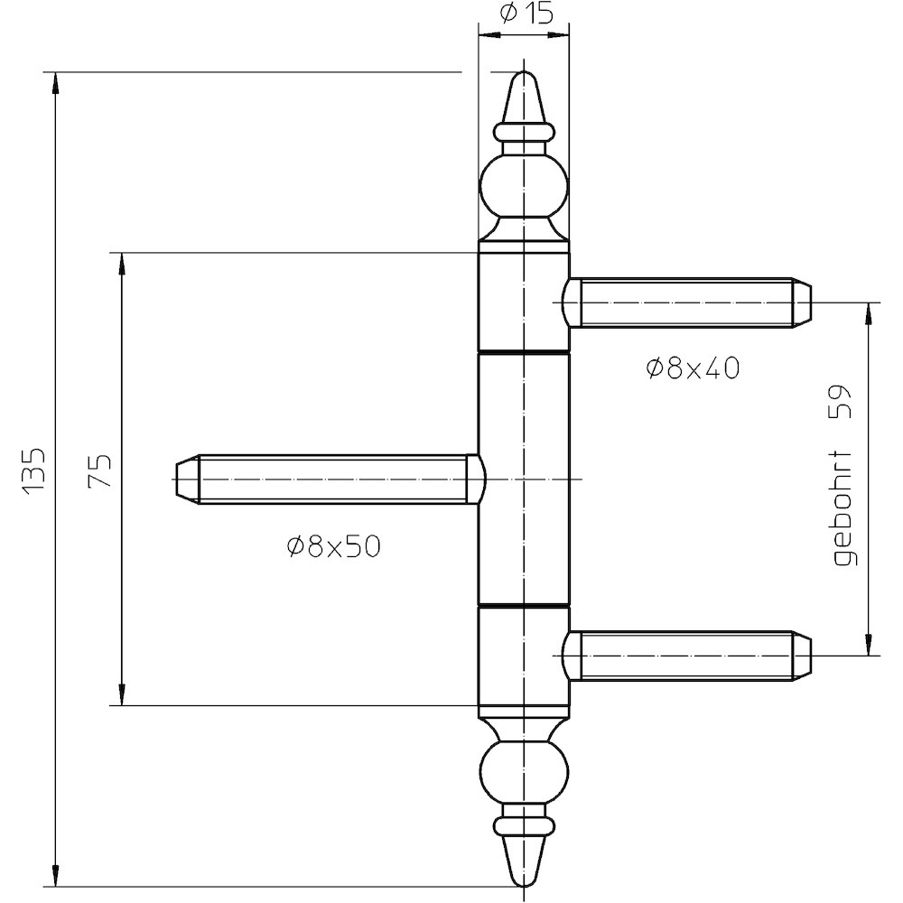 SIMONSWERK, Zimmertür-Einbohrband, Modell: BAKA®, Modellnummer: C 1-15 WF ZK, Bandkonstruktion: 3-teilig, Material: Stahl, Farbton: vergoldet, Oberfläche: poliert, Kopfausbildung: Zierkopf, Rollenlänge: 75 mm, Rollendurchmesser: 15 mm, DIN-Richtung: DIN Links-Rechts, Ausführung: mit Zierkopf, Anwendung: Blendrahmen, Blockzarge, Befestigungsart Flügelteil: zum Eindrehen, Befestigungsart Rahmenteil: zum Eindrehen, Befestigungsabstand Rahmenteil: 59 mm, Gesamtlänge: 135 mm, Lagerung: wartungsfrei, Tragkraft pro Flügel (1 x 2 m) bei zwei Bändern: 60 kg, Zapfenlänge Flügelteil: 50 mm, Zapfendurchmesser Flügelteil: 8 mm, Zapfenlänge Rahmenteil: 40 mm, Zapfendurchmesser Rahmenteil: 8 mm, Verstellbar: fest, Türwerkstoff: Holz, Türausprägung: Tür gefälzt, Überschlagstärke min.: 12 mm