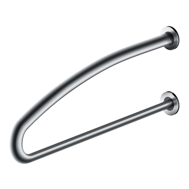 Die maximale Belastbarkeit beträgt hier 100 kg. Die verdeckte Befestigung des Haltegriffs erfolgt mittels zweier schwarzgrauer Wandadapter aus Aluminium. Diese werden mit runden 85 mm Edelstahlabdeckblenden verblendet.