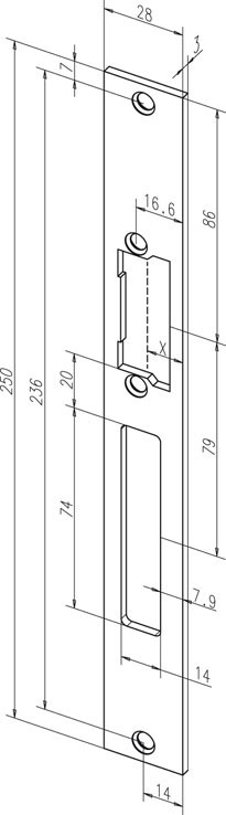 effeff, Türrahmen-Flachschließblech, Ausführung: für Türöffner, Modellnummer: 62B, Material: Edelstahl, DIN-Richtung: DIN Links-Rechts, Farbton: edelstahl, Oberfläche: geschliffen, Ausfräsung: mit Fallen und Riegelausschnitt, Türausprägung: Türe stumpf, Türflügelanzahl: einflügelig, Befestigungsart: zum Aufschrauben, Schließblechbreite: 28 mm, Schließblechlänge: 250 mm, Schließblechstärke: 3 mm, Schließblechausführung: kantig, Maß X min.: 8,3 mm, Maß X max.: 11,3 mm, Vorgerichtet: für ProFix®2-Türöffner der Serie 118.13, Türart: Objekttür, Haustür, Rahmenwerkstoff: Holz, Aluminium, Kunststoff
