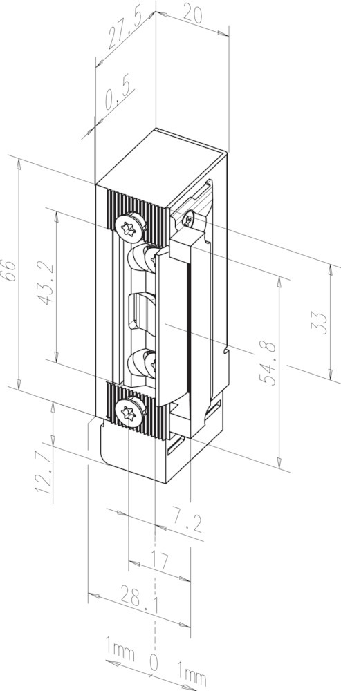 effeff, Türrahmen-Fluchttüröffner, Modellnummer: 332.208, Ausführung: mit Flachschließblech, mit Riegelausschnitt, Bauform: symmetrisch, Ergänzung: mit verstellbarer Falle, mit Rückmeldekontakt, mit Ankerkontakt, mit Diode, DIN-Richtung: DIN Links-Rechts, Einbaulage: senkrecht, waagerecht, Entriegelung: ohne, Funktion: Ruhestrom, Schließblechausführung: kantig, Schließblechbreite: 34 mm, Schließblechlänge: 250 mm, Schließblechstärke: 3 mm, Material Schließblech: Edelstahl, Farbton Schließblech: edelstahl, Oberfläche Schließblech: geschliffen, Befestigungsart: zum Einlassen, Material Gehäuse: Stahl, Einzelteilmaterial Falle: Stahl, Einzelteilmaterial Aufschraubstück: Stahl, Öffnerbreite: 20 mm, Öffnerhöhe: 77,6 mm, Öffnertiefe: 28 mm, Verstellbereich Falle: 4 mm, Spannung: 24 V, Spannungsart: DC, Stromanschluss: klemmbar, steckbar, Stromaufnahme DC: 100 mA, Fallenvorlast DC max.: 3.000 N, Aufbruchfestigkeit: 3.000 N, Betriebstemperatur min.: -15 °C, Betriebstemperatur max.: 40 °C, Nennwiderstand: 260 O, Falleneingrifftiefe: 6 mm, Türart: Fluchtwegtür, Türausprägung: Türe stumpf, Türflügelanzahl: einflügelig, Rahmenwerkstoff: Holz, Aluminium, Kunststoff, Zulassung: für Sicherheitsanwendungen, Zusatzinformation: An Feuerschutztüren nur als Zusatzverriegelung einsetzbar.