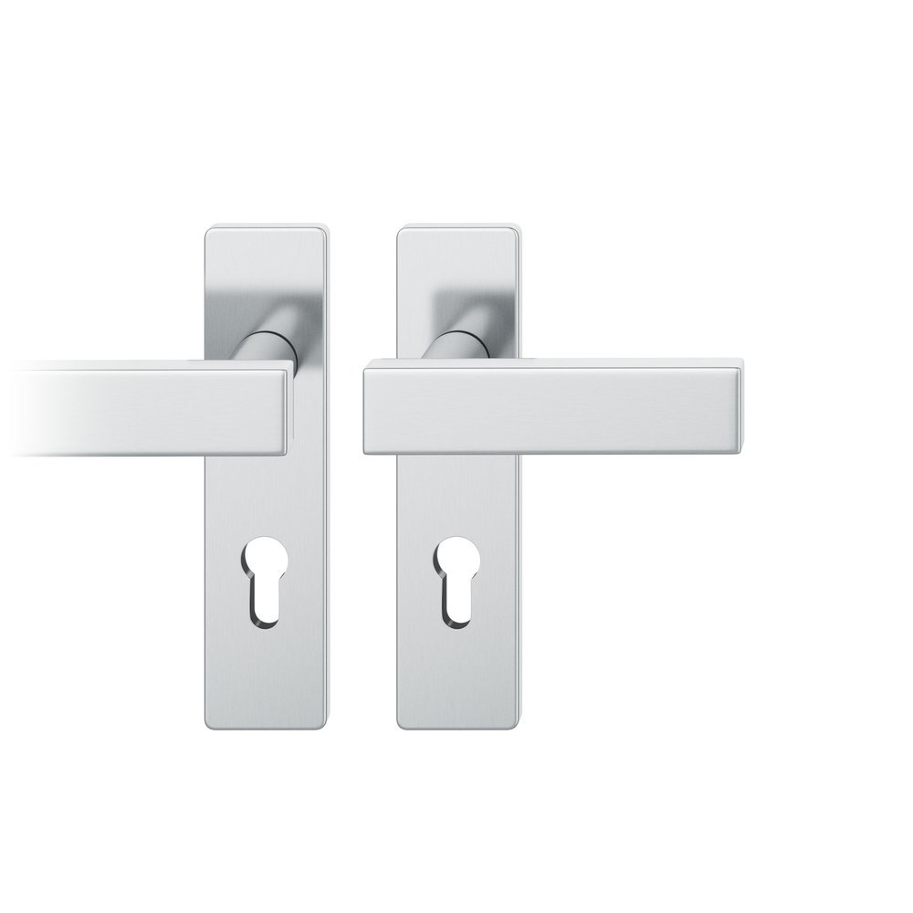 Produktinformationen "FSB Drückergarnitur 12 1003, Kurzschild, eckig, Profilzylinder gelocht, Entfernung 72mm, Vierkant 8mm, DIN Links-Rechts, Türstärke 39 - 58mm, mit Stütznocken, edelstahl fein matt, Adapter-Standardlager"