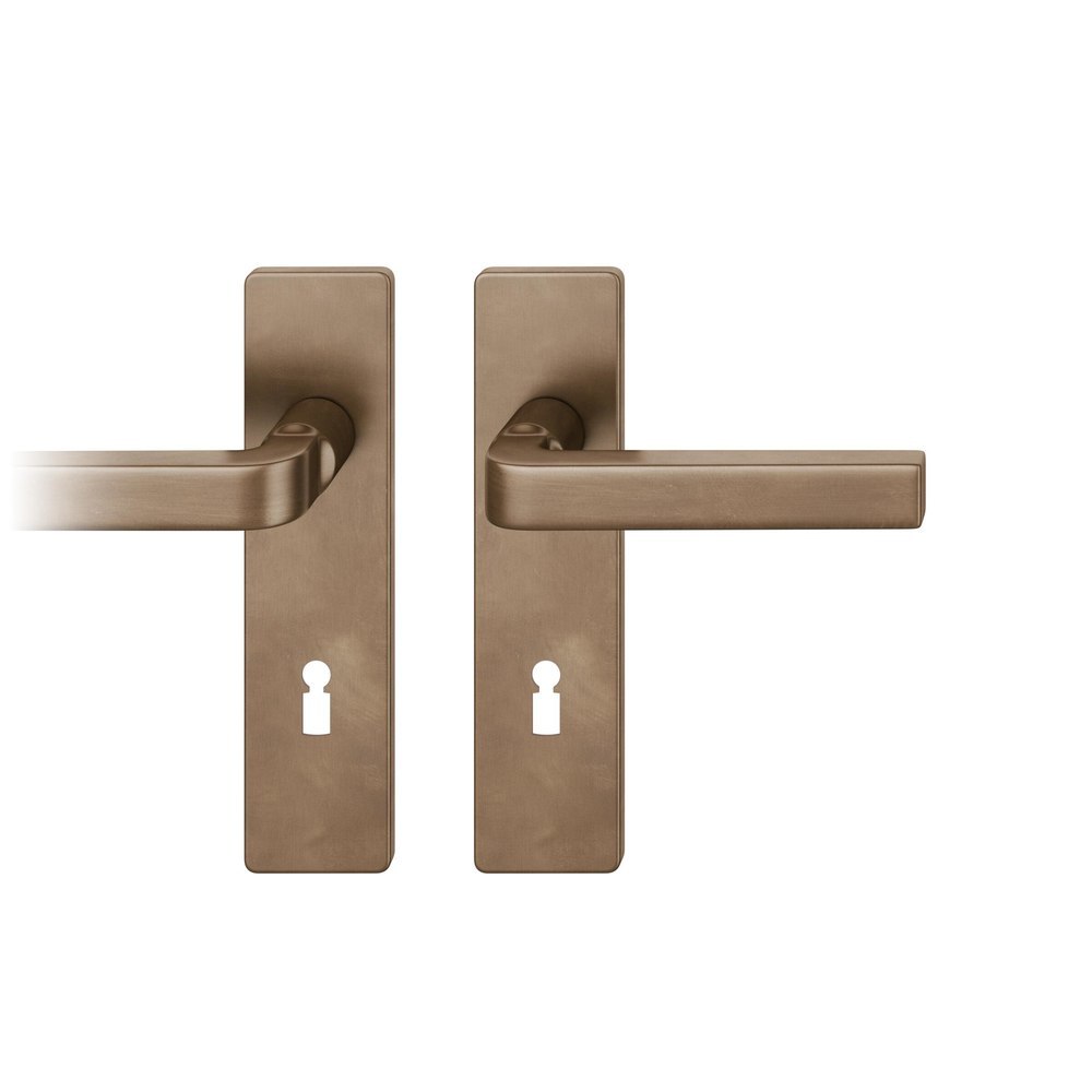 Produktinformationen "FSB Drückergarnitur 12 1004, Kurzschild, eckig, Buntbart gelocht, Entfernung 72mm, Vierkant 8mm, DIN Links-Rechts, Türstärke 39 - 58mm, mit Stütznocken, dunkelbronze patiniert gewachst, Adapter-Standardlager"