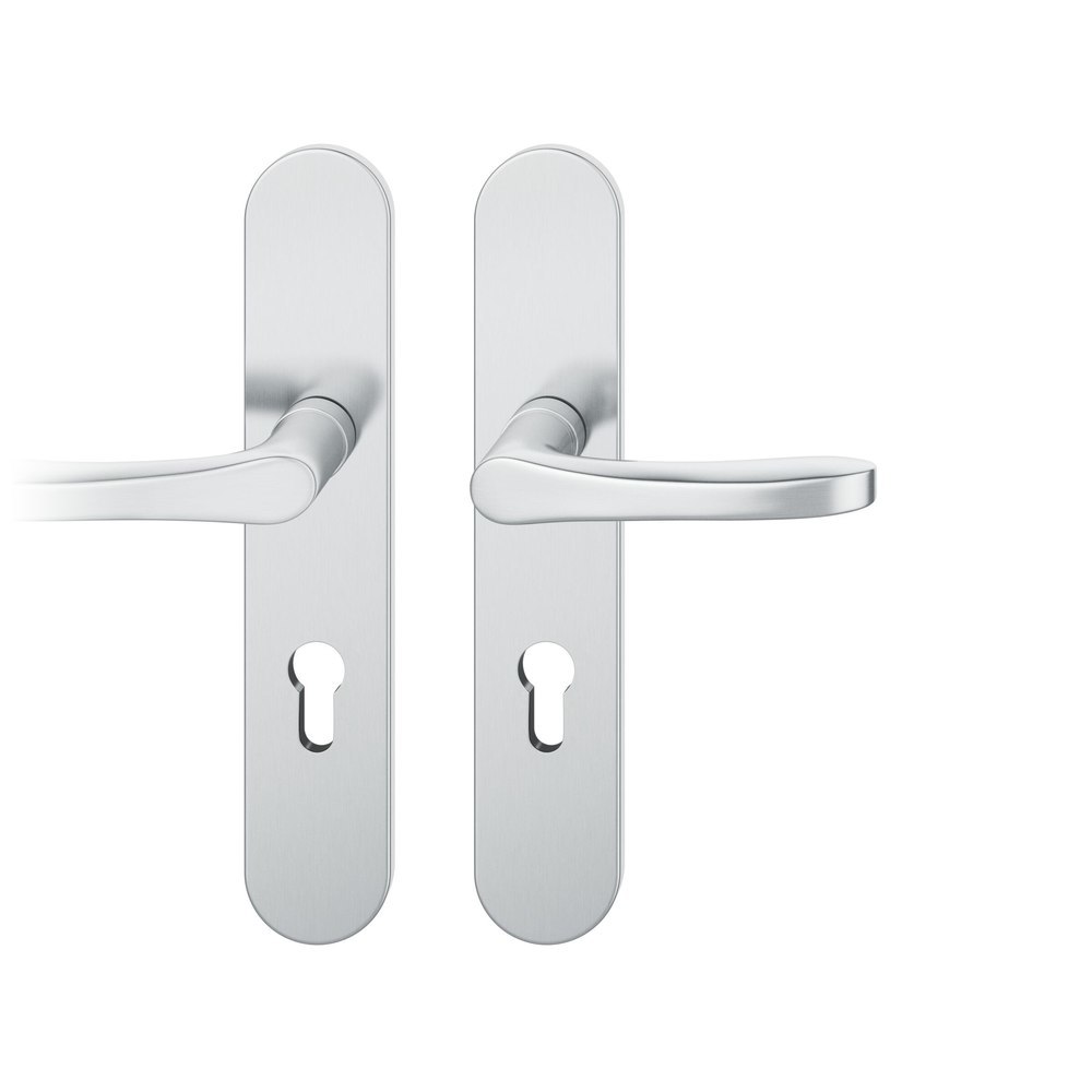 Produktinformationen "FSB Drückergarnitur 12 1106, Langschild, oval, Profilzylinder gelocht, Entfernung 72mm, Vierkant 8mm, DIN Links-Rechts, Türstärke 39 - 58mm, mit Stütznocken, edelstahl fein matt, Adapter-Standardlager"