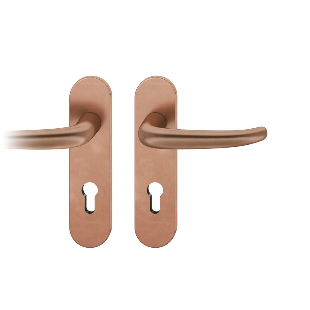 Produktinformationen "FSB Drückergarnitur 72 1023, Kurzschild, oval, Profilzylinder gelocht, Entfernung 72mm, Vierkant 8mm, DIN Links, Türstärke 39 - 48mm, mit Stütznocken, hellbronze patiniert gewachst, Ausgleichslager® 3"