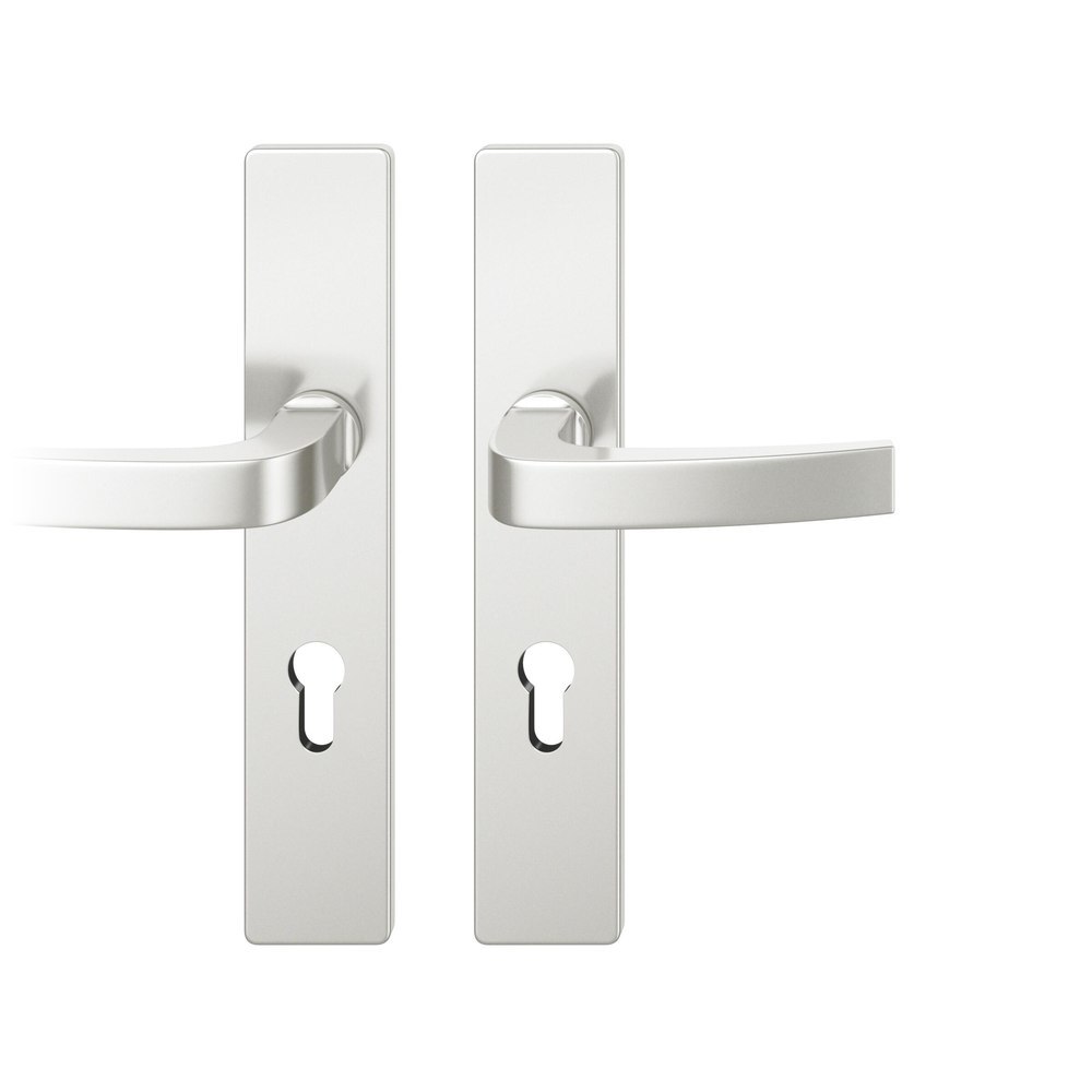 Produktinformationen "FSB Drückergarnitur 72 1163, Langschild, eckig, Profilzylinder gelocht, Entfernung 72mm, Vierkant 8mm, DIN Links, Türstärke 39 - 48mm, Befestigungstechnik mit Stütznocken, silber, naturfarben, eloxiert, 35°"