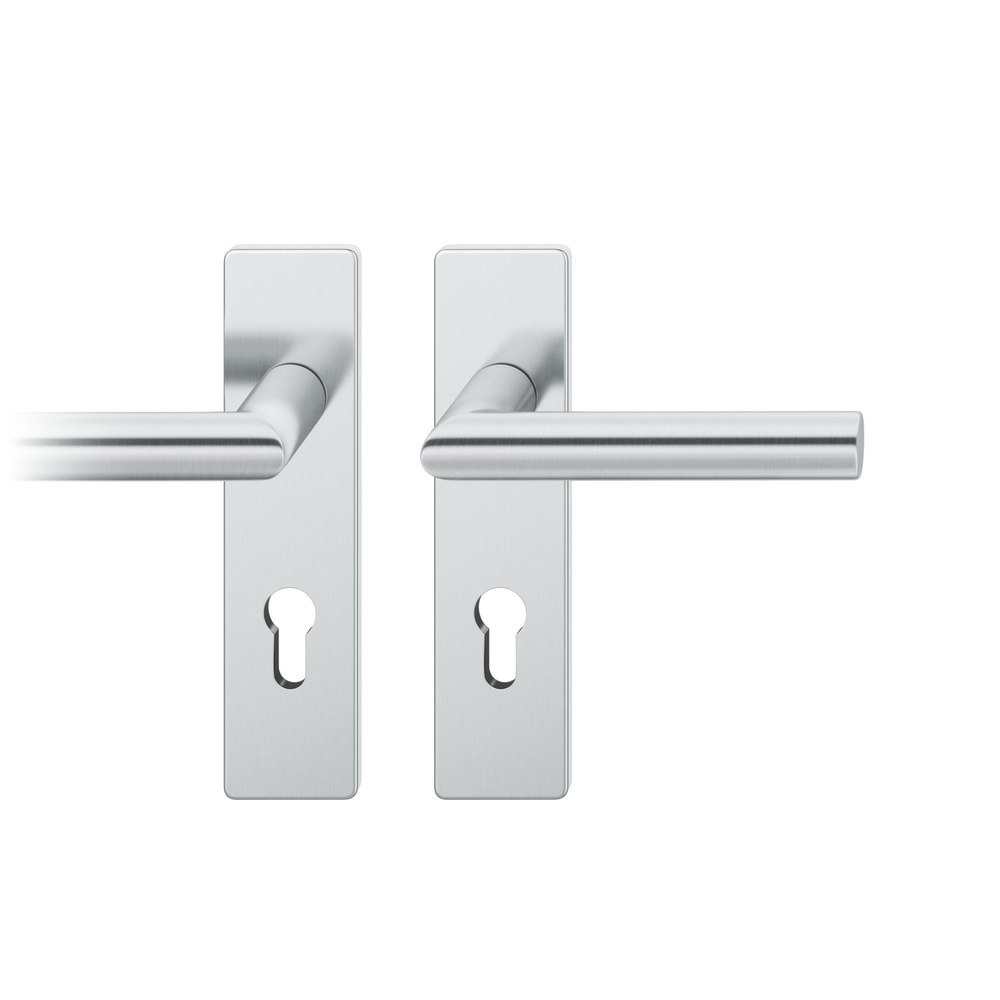 Produktinformationen "FSB Drückergarnitur 72 1076, Kurzschild, eckig, Profilzylinder gelocht, Entfernung 72mm, Vierkant 8mm, DIN Rechts, Türstärke 39 - 48mm, Befestigungstechnik mit Stütznocken, grau, edelstahl, fein matt,35°"