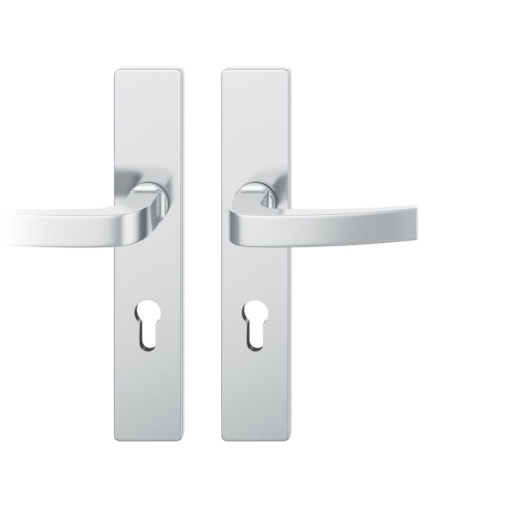 Produktinformationen "FSB Drückergarnitur 12 1163, Langschild, eckig, Profilzylinder gelocht, Entfernung 72mm, Vierkant 8mm, DIN Links-Rechts, Türstärke 39 - 58mm, mit Stütznocken, edelstahl fein matt, Adapter-Standardlager"
