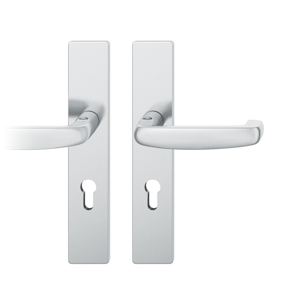 Produktinformationen "FSB Drückergarnitur 72 1159, Langschild, eckig, Profilzylinder gelocht, Entfernung 72mm, Vierkant 8mm, DIN Rechts, Türstärke 39 - 48mm, mit Stütznocken, edelstahl fein matt, Ausgleichslager® 3"