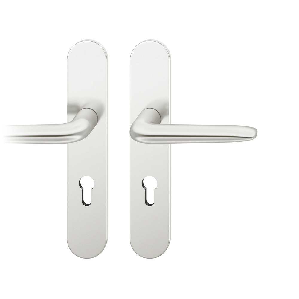Produktinformationen "FSB Drückergarnitur 76 1292, Langschild oval, Profilzylinder gelocht, Entfernung 72mm, Vierkant 9, DIN Rechts, Türstärke 39 - 48mm, mit Stütznocken, naturfarben eloxiert, Ausgleichslager® 3"