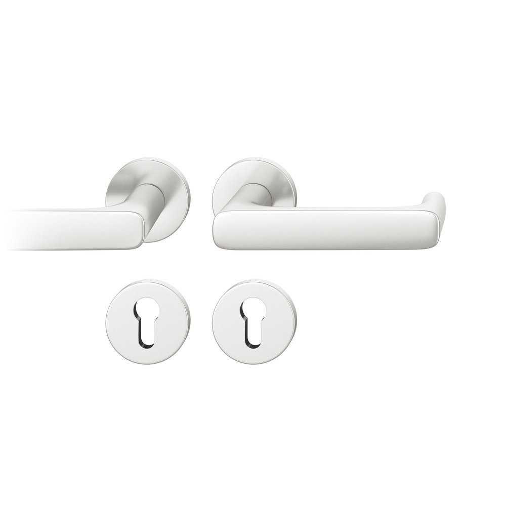 FS-AGL3-Drückergarnitur links, 9mm PZ Rundrosette, max. 35°. TS 39-48mm, Aluminium naturfarbig