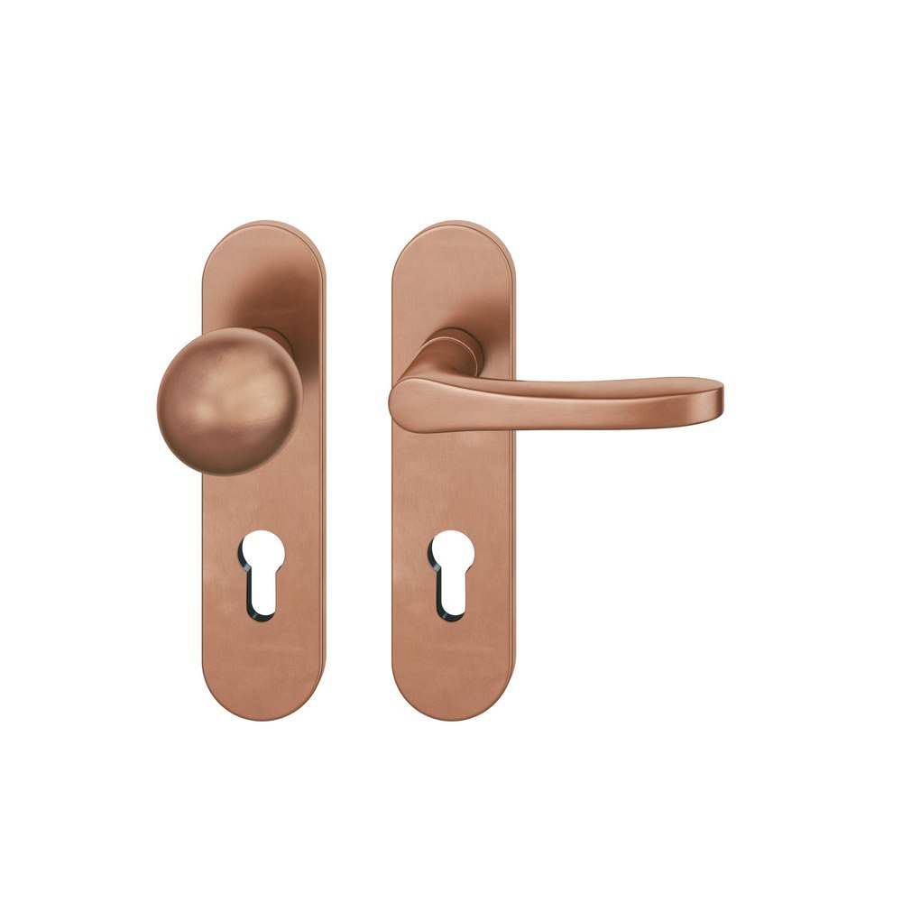 Produktinformationen "FSB für Feuerschutz Wechselgarnitur 76 1106, Kurzschild, oval, Profilzylinder gelocht, Entfernung 72mm, Vierkant 9mm, DIN Rechts, Türstärke 39 - 48mm, mit Stütznocken, hellbronze patiniert gewachst, Ausgleichslager® 3"