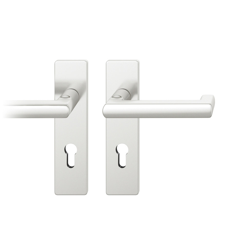 FS-AGL3-Drückergarnitur links 9mm PZ 72mm eckiges Kurzschild EN 179. max. 35°. TS 39-48mm Aluminium naturfarbig
