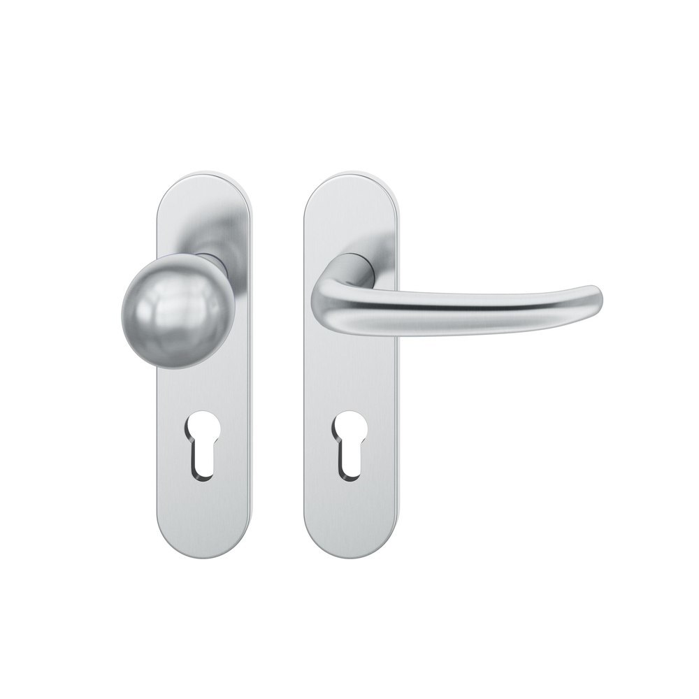 Produktinformationen "FSB für Feuerschutz Wechselgarnitur 76 1023, Kurzschild, oval, Profilzylinder gelocht, Entfernung 72mm, Vierkant 9mm, DIN Rechts, Türstärke 39 - 48mm, mit Stütznocken, edelstahl fein matt, Ausgleichslager® 3"