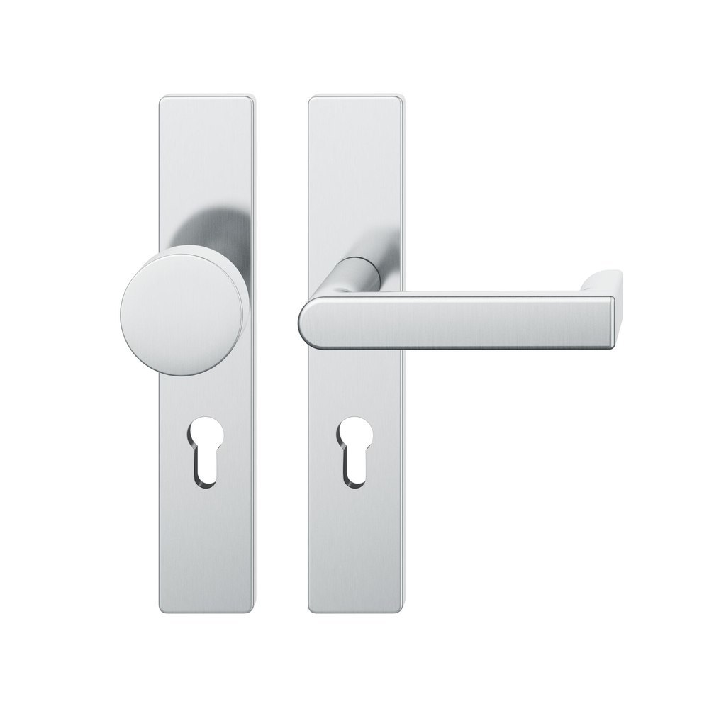 Produktinformationen "FSB für Feuerschutz Wechselgarnitur 79 1245, Langschild, eckig, Profilzylinder gelocht, Entfernung 72mm, Vierkant 9mm, DIN Rechts, Türstärke 39 - 48mm, mit Stütznocken, edelstahl fein matt, Ausgleichslager® 3"