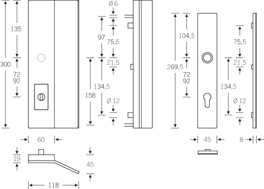 FSB Haustür Schutz-Wechselgarnitur, Abdeckung: Langschild, Modellnummer: 73 7360, Lochung: Profilzylinder gelocht, Entfernung: 92 mm, Vierkant: 10, Material: edelstahl, Farbton: edelstahl, Oberfläche: fein matt, DIN-Richtung: DIN Links, Ausführung: mit Drücker 1108, Befestigungsart: verdeckt verschraubt, Befestigungstechnik: mit Stütznocken, Befestigungssystem: Stiftverbindung, Eigenschaft: Griffplatte fest auf Schild, Schildbreite außen: 60 mm, Schildbreite innen: 45 mm, Schildlänge außen: 300 mm, Schildstärke außen: 19 mm, Schildstärke innen: 8 mm, Griffplattenlänge: 300 mm, Griffplattenbreite: 118 mm, Griffplattenhöhe: 45 mm, Anschlagrichtung: Drücker links zeigend, Drückerbefestigung: Stabil-Wechselstift mit Rolle, Form: eckig, Türstärke min.: 67 mm, Türstärke max.: 69 mm, Türart: Außentüren, Türwerkstoff: Holz, stahl, Benutzerklasse: Klasse 4, Widerstandsklasse: ES 3 (SK4), Norm: DIN 18257, DIN EN 1906