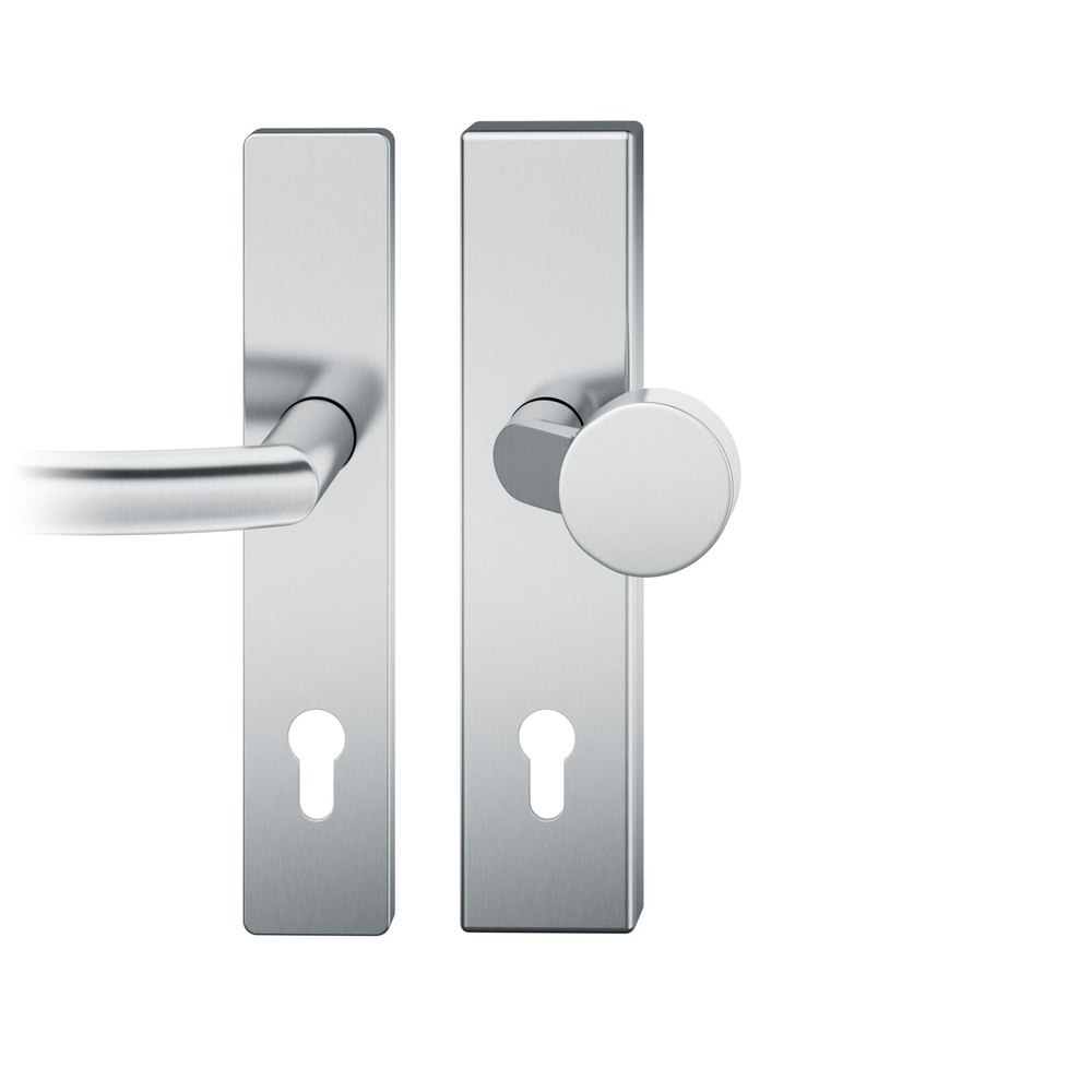 FSB Vollblatt Sicherheits-Wechselgarnitur 73 7379,Langschild,ES 1,ohne Zylinderabdeckung 92/10,DIN Links-Rechts,edelstahl fein matt,Türstärke67-69,Flachknopf gekröpft/gebogen