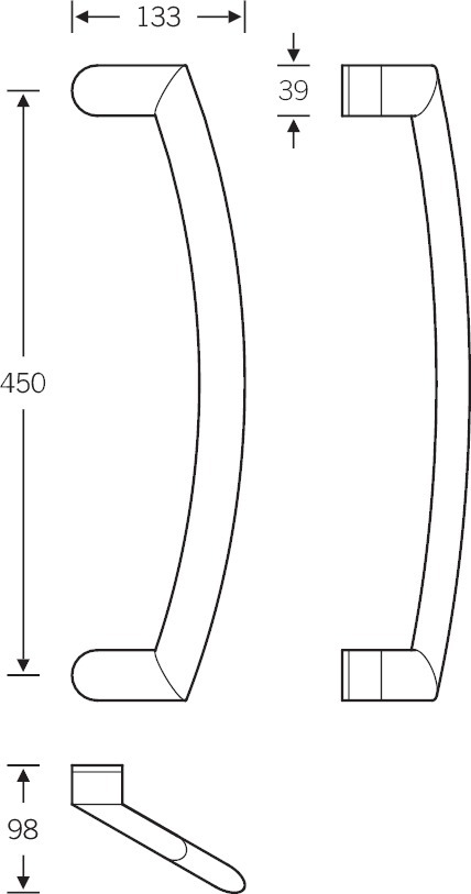 FSB Haustür Stoßgriff, Ausführung: gekröpft, halbgebogen, Modellnummer: 66 6537, Befestigungsabstand: 450 mm, Grifftiefe: 98 mm, Material: edelstahl, Farbton: edelstahl, Oberfläche: fein matt, Befestigungsart: verdeckt verschraubt, DIN-Richtung: DIN Links-Rechts, Form: oval, Türwerkstoff: aluminium, Holz, Kunststoff, stahl