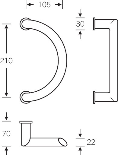 FSB Haustür Stoßgriff, Ausführung: gekröpft, halbgebogen, Modellnummer: 66 6612, Befestigungsabstand: 210 mm, Griffdicke: 22 mm, Grifflänge: 232 mm, Griffbreite: 105 mm, Grifftiefe: 70 mm, Material: edelstahl, Farbton: edelstahl, Oberfläche: fein matt, Befestigungsart: verdeckt verschraubt, DIN-Richtung: DIN Links-Rechts, Form: oval, Türwerkstoff: aluminium, Holz, Kunststoff, stahl