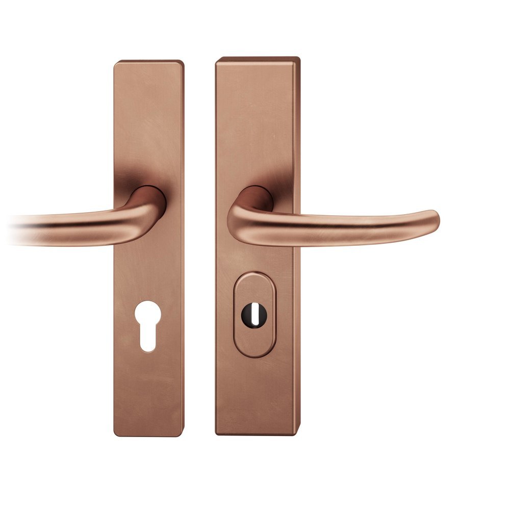 Produktinformationen "FSB Vollblatt Sicherheits-Drückergarnitur 73 7376,Langschild,ES 1,mit Zylinderabdeckung 72/8,DIN Links,hellbronze patiniert gewachst,Türstärke67-69,gebogen/gebogen"