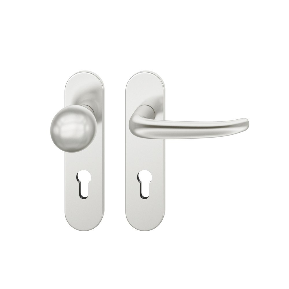 FSB Wechselgarnitur 72 1023; Produkttyp: Wechselgarnitur; Produkttyp (Hersteller): Wechselgarnitur; Ausführung: Kurzschild; Befestigungsart: verdeckt verschraubt; Befestigungstechnik: mit Stütznocken; Form: oval; Vierkant: 8 mm; Material: Aluminium; Form Türgriff (innen): gebogen; Form Türgriff (außen): Kugelknopf; Gewinde Knopf/Griffplatte: M12; Durchmesser Türgriff (außen): 50 mm; Breite Türgriff (innen): 15 mm; Länge Türgriff (innen): 135 mm; Höhe Türgriff (innen): 59 mm; Höhe Türgriff (außen): 70 mm; Schildbreite außen: 45 mm; Schildbreite innen: 45 mm; Schildlänge außen: 185 mm; Schildlänge innen: 185 mm; Schildstärke außen: 7 mm; Schildstärke innen: 7 mm; Lagerung: mit Rückholfeder, Ausgleichslager® 3, festdrehbar; Einsatzbereich: Zimmertür; Türart: Vollblatt; Türwerkstoff: Stahl, Holz; Norm: DIN EN 1906; Lochung: Profilzylinder gelocht; Entfernung: 72 mm; DIN-Richtung: DIN Links; Farbe: silber; Farbton: naturfarben; Oberfläche: eloxiert; Ausführung Vierkant: Rollenwechselstift; Betätigungswinkel max.: 35 °; Türstärke min.: 39 mm; Türstärke max.: 48 mm