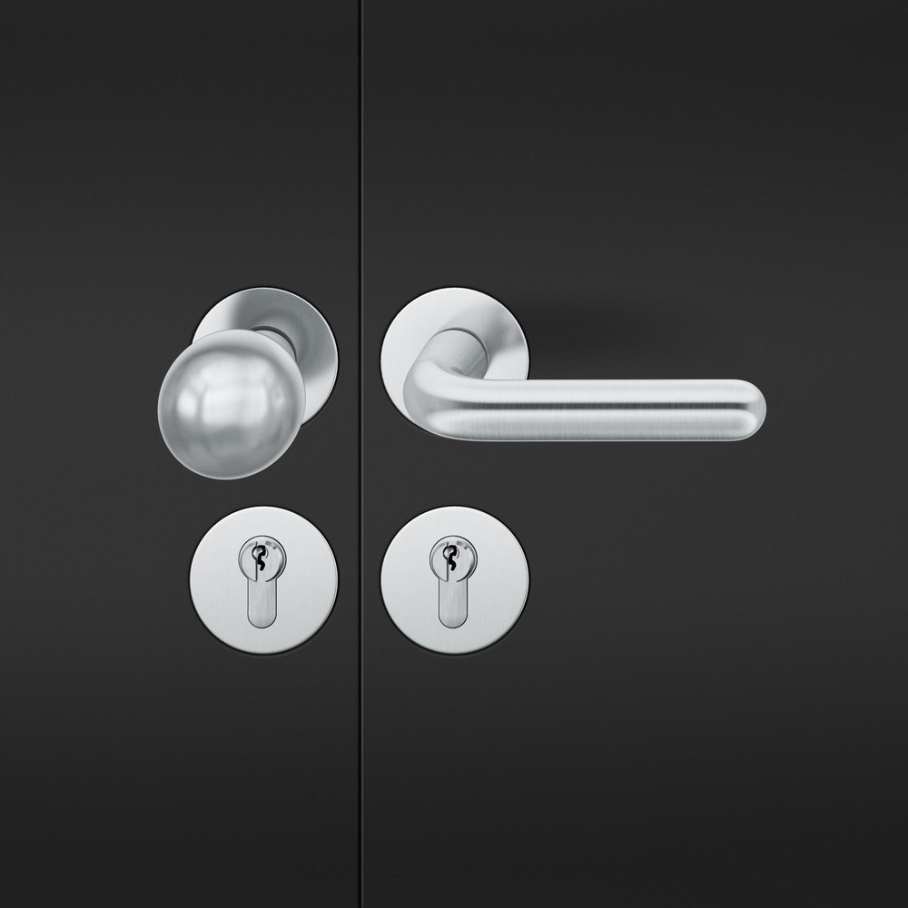 FSB Wechselgarnitur 72 1147; Produkttyp: Wechselgarnitur; Produkttyp (Hersteller): Wechselgarnitur; Ausführung: Rosette; Befestigungsart Drückerrosette (außen): verdeckt verschraubt; Befestigungsart Drückerrosette (innen): verdeckt verschraubt; Befestigungsart Schlüsselrosette (außen): verdeckt verschraubt; Befestigungsart Schlüsselrosette (innen): verdeckt verschraubt; Befestigungstechnik: mit Stütznocken; Montageart: flächenbündig; Form Drückerrosette: rund; Form Schlüsselrosette (außen): rund; Form Schlüsselrosette (innen): rund; Vierkant: 8 mm; Material: Edelstahl; Form Türgriff (innen): gebogen; Form Türgriff (außen): Kugelknopf; Ausführung Türgriff (außen): fest; Gewinde Knopf/Griffplatte: M12; Durchmesser Türgriff (innen): 20 mm; Durchmesser Türgriff (außen): 50 mm; Durchmesser Schlüsselrosette: 55 mm; Länge Türgriff (innen): 132 mm; Höhe Türgriff (innen): 63 mm; Höhe Türgriff (außen): 66 mm; Durchmesser Drückerrosette (außen): 55 mm; Durchmesser Drückerrosette (innen): 55 mm; Höhe Drückerrosette (außen): 3 mm; Höhe Drückerrosette (innen): 3 mm; Höhe Schlüsselrosette (außen): 3 mm; Höhe Schlüsselrosette (innen): 3 mm; Lagerung: festdrehbar, Ausgleichslager® 3; Einsatzbereich: Objekttür; Türart: Vollblatt; Türwerkstoff: Holz, Stahl; Lochung: Profilzylinder gelocht; DIN-Richtung: DIN Links; Farbe: grau; Farbton: edelstahl; Oberfläche: fein matt; Ausführung Vierkant: Rollenwechselstift; Betätigungswinkel max.: 35 °; Türstärke min.: 45 mm; Türstärke max.: 54 mm; Norm: DIN EN 1906