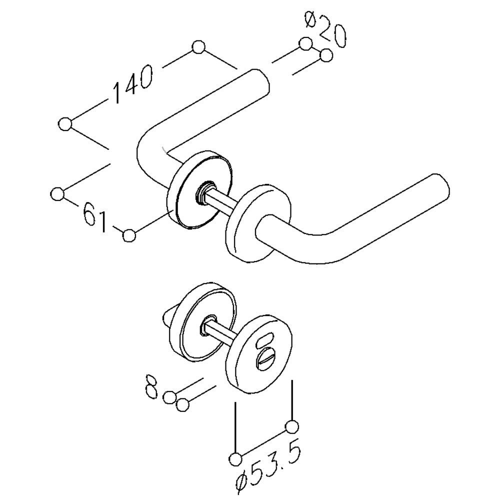 HELO Objekttür Drückergarnitur, Abdeckung: mit Rosetten, Modell: EST.BZG, Modellnummer: 51, Lochung: WC Schauscheibe/Schlitzkopf, Vierkant: 8, Riegel-Vierkant: 8 mm, Material: edelstahl, Farbton: edelstahl, Oberfläche: fein matt, DIN-Richtung: DIN Links-Rechts, Lagerung: Gleitlager, wartungsfrei, festdrehbar, Befestigungstechnik: mit Stütznocken, Befestigungsart: verdeckt verschraubt, Befestigungssystem: Stiftverbindung, Material Unterkonstruktion: Kunststoff-Stahlverbundbau, Anschlagrichtung: Drücker rechts/links verwendbar, Drückerbefestigung: Vierkantstift, Drückerform: L-Form, Drückerdurchmesser: 20 mm, Drückerlänge: 140 mm, Drückerhöhe: 53 mm, Form: rund, Stärke Abdeckung: 8 mm, Türstärke min.: 35 mm, Türstärke max.: 44 mm, Türart: Innentüren, Türwerkstoff: Holz, stahl, Benutzerklasse: Klasse 4, Norm: DIN EN 1906, DIN 18255