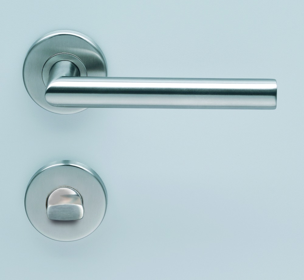 HELO, Objekttür-Drückergarnitur, Abdeckung: mit Rosetten, Modell: NB, Modellnummer: 100.12, Lochung: WC Schauscheibe/Schlitzkopf, Vierkant: 8mm, Material: Edelstahl, Farbton: edelstahl, Oberfläche: fein matt, DIN-Richtung: DIN Links-Rechts, Lagerung: Gleitlager, wartungsfrei, festdrehbar, Befestigungstechnik: ohne Stütznocken, Befestigungsart: verdeckt verschraubt, Befestigungssystem: Stiftverbindung, Durchmesser: 52mm, Anschlagrichtung: Drücker rechts/links verwendbar, Drückerbefestigung: Vierkantstift, Drückerform: Gehrung, Drückerdurchmesser: 19mm, Drückerlänge: 135mm, Drückerhöhe: 60mm, Form: rund, Stärke Abdeckung: 8mm, Türstärke min.: 38mm, Türstärke max.: 60mm, Türart: Außentüren, Türwerkstoff: Holz, Stahl, Benutzerklasse: Klasse 3, Norm: DIN EN 1906, DIN 18255