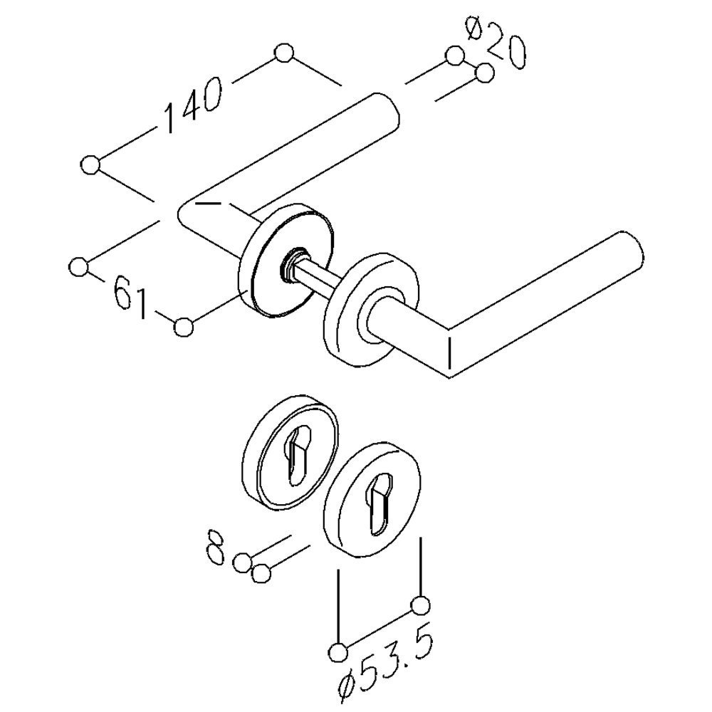 HELO feuerhemmend Drückergarnitur, Abdeckung: mit Rosetten, Modell: EST.ZG, Modellnummer: FS 21, Lochung: Profilzylinder gelocht, Vierkant: 9, Material: edelstahl, Farbton: edelstahl, Oberfläche: fein matt, DIN-Richtung: DIN Links-Rechts, Lagerung: Gleitlager, wartungsfrei, festdrehbar, Befestigungstechnik: mit Stütznocken, Befestigungsart: verdeckt verschraubt, Befestigungssystem: Stiftverbindung, Material Unterkonstruktion: Kunststoff-Stahlverbundbau, Anschlagrichtung: Drücker rechts/links verwendbar, Drückerbefestigung: Vierkantstift, Drückerform: Gehrung, Drückerdurchmesser: 20 mm, Drückerlänge: 140 mm, Drückerhöhe: 53 mm, Form: rund, Stärke Abdeckung: 8 mm, Türstärke min.: 45 mm, Türstärke max.: 54 mm, Türart: Außentüren, Türwerkstoff: Holz, stahl, Benutzerklasse: Klasse 4, Norm: DIN 18273, DIN EN 1906, DIN 18255, Zulassung: für Feuerschutz, für Rauchschutz
