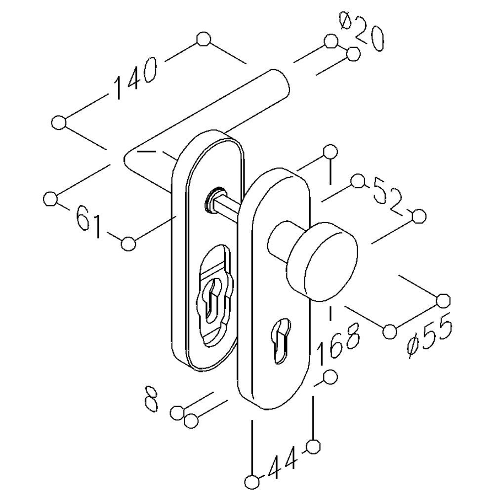 HELO feuerhemmend Wechselgarnitur, Abdeckung: Kurzschild, Modell: EST.WD, Modellnummer: FS 21, Lochung: Profilzylinder gelocht, Entfernung: 72 mm, Vierkant: 9, Material: edelstahl, Farbton: edelstahl, Oberfläche: fein matt, DIN-Richtung: DIN Links-Rechts, Lagerung: festdrehbar, wartungsfreies Gleitlager, Befestigungsart: verdeckt verschraubt, Befestigungstechnik: mit Stütznocken, Material Unterkonstruktion: Kunststoff-Stahlverbundbau, Befestigungssystem: Stiftverbindung, Drückerform: Gehrung, Drückerdurchmesser: 20 mm, Drückerhöhe: 53 mm, Drückerlänge: 140 mm, Eigenschaft: Knopf fest auf Schild, Länge: 168 mm, Breite: 44 mm, Knopfform: rund, Knopfdurchmesser: 55 mm, Knopfhöhe: 45 mm, Anschlagrichtung: Drücker rechts/links verwendbar, Drückerbefestigung: Wechselstift, Form: oval, Schildstärke außen: 10 mm, Schildstärke innen: 10 mm, Türstärke min.: 45 mm, Türstärke max.: 54 mm, Türart: Außentüren, Türwerkstoff: Holz, stahl, Benutzerklasse: Klasse 4, Norm: DIN 18273, DIN 18255, DIN EN 1906, Zulassung: für Feuerschutz, für Rauchschutz