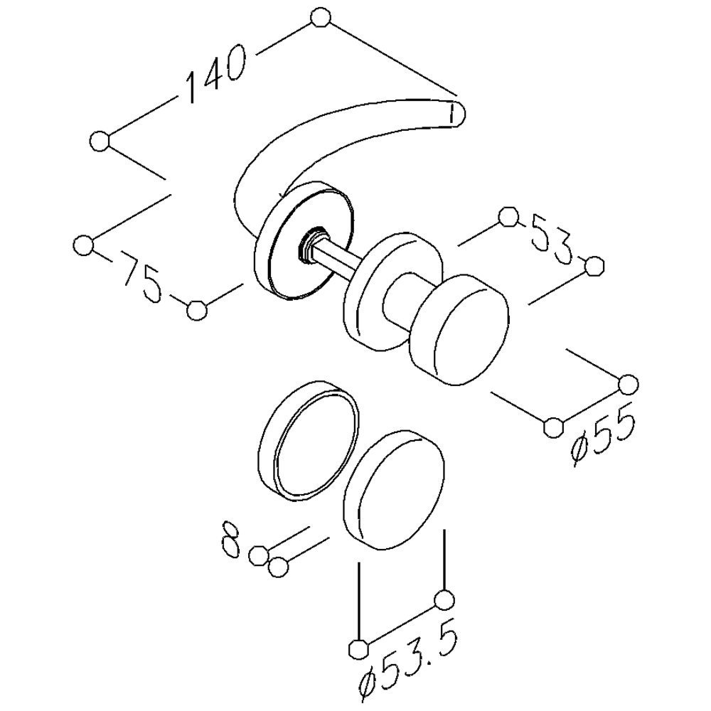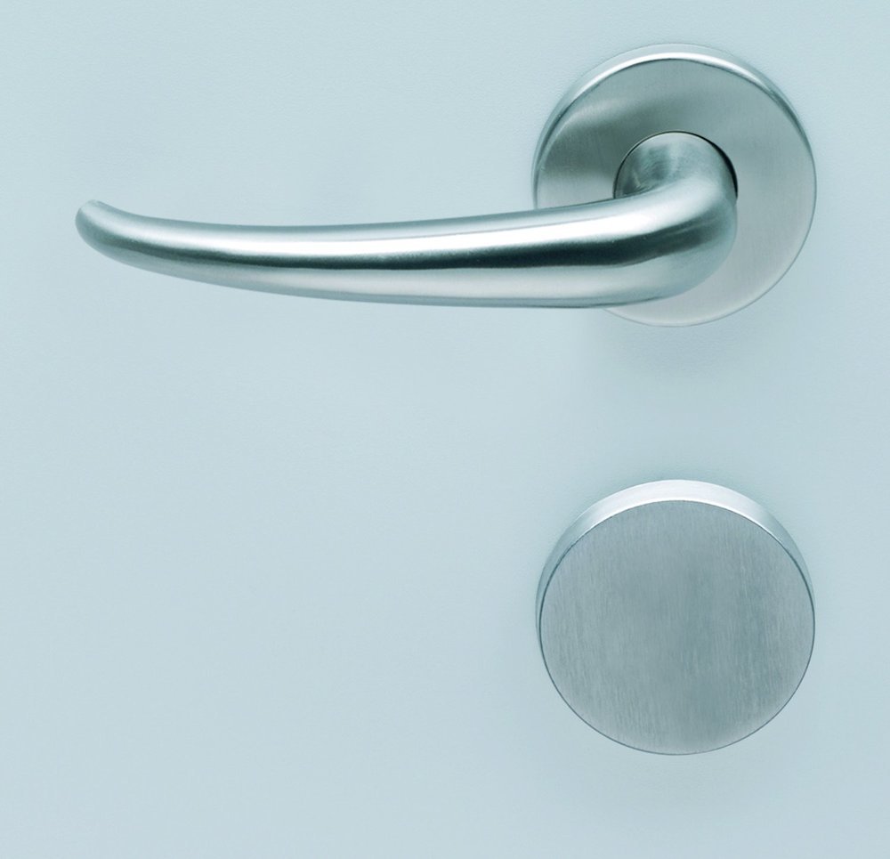 HELO, Objekttür-Wechselgarnitur, Abdeckung: mit Rosetten, Lochung: Blind, Vierkant: 8 mm, Modell: EST.WG, Modellnummer: 61/K5, Material: Edelstahl, Farbton: edelstahl, Oberfläche: fein matt, DIN-Richtung: DIN Links, Befestigungsart: verdeckt verschraubt, Befestigungstechnik: mit Stütznocken, Benutzerklasse: Klasse 4, Stärke Abdeckung außen: 8 mm, Stärke Abdeckung innen: 8 mm, Türstärke min.: 35 mm, Türstärke max.: 44 mm, Befestigungssystem: Stiftverbindung, Form: rund, Lagerung: Gleitlager, wartungsfrei, festdrehbar, Durchmesser: 53,5 mm, Türart: Außentüren, Türwerkstoff: Holz, Stahl, Drückerbefestigung: Wechselstift, Drückerform: gebogen, Drückerlänge: 140 mm, Drückerhöhe: 67 mm, Eigenschaft: Knopf fest auf Rosette, Knopfform: rund, Knopfdurchmesser: 55 mm, Knopfhöhe: 45 mm, Norm: DIN 18255, DIN EN 1906, Zusatzinformation: mit beschichteten Hülsenschrauben