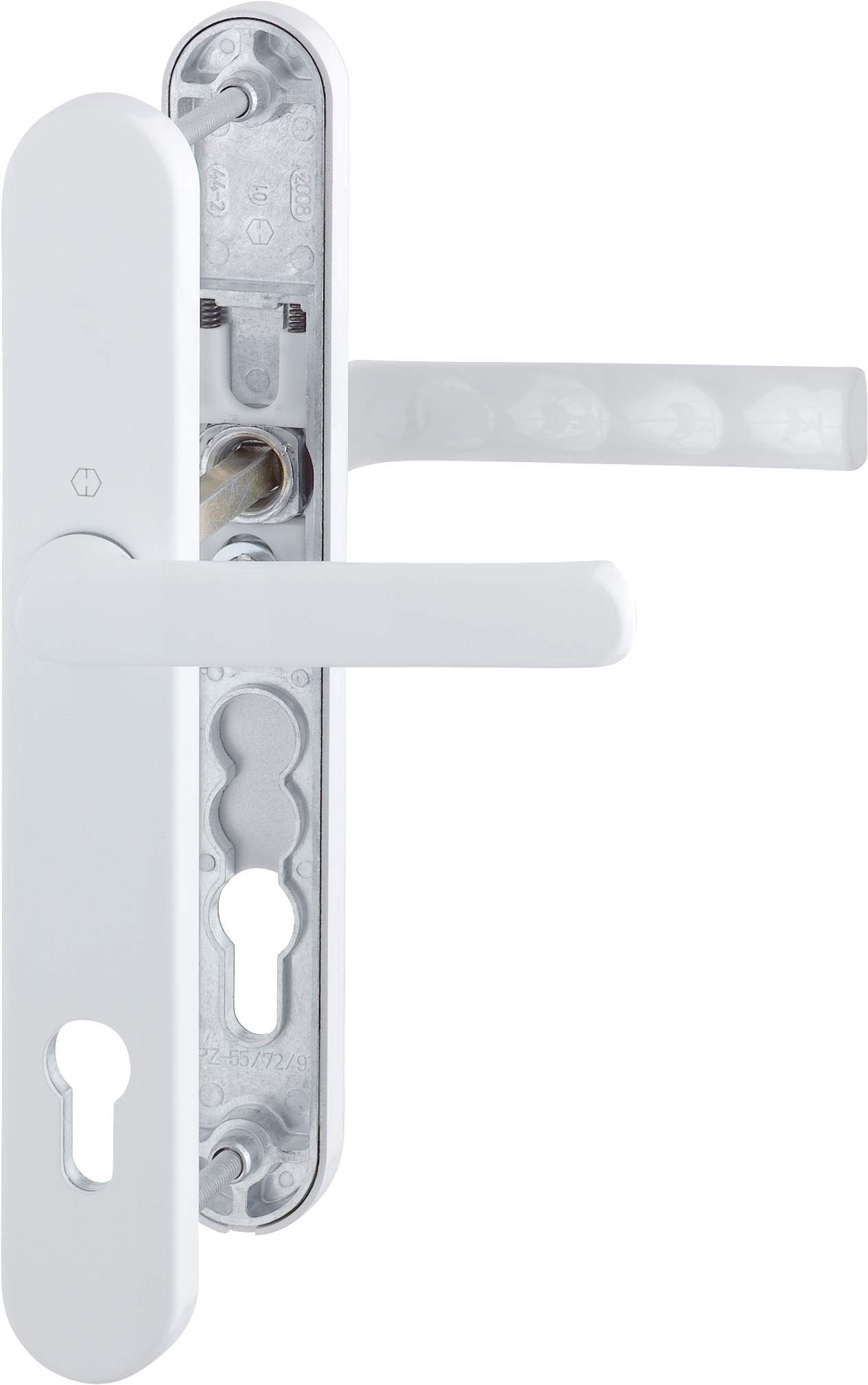 Drückergarnitur Hamburg 099KH/3357N/1700FA; Produkttyp: Drückergarnitur; Produkttyp (Hersteller): Drückergarnitur; Ausführung: Langschild; Befestigungsart: verdeckt verschraubt; Befestigungstechnik: mit Stütznocken; Form: oval; Vierkant: 8 mm; Material: Aluminium; Material Unterkonstruktion: Zamak; Form Türgriff (innen): L-Form; Form Türgriff (außen): L-Form; Länge Türgriff (innen): 128 mm; Länge Türgriff (außen): 126 mm; Höhe Türgriff (innen): 44 mm; Höhe Türgriff (außen): 17 mm; Schildlänge außen: 250 mm; Schildlänge innen: 250 mm; Schildstärke außen: 10 mm; Schildstärke innen: 10 mm; Lagerung: wartungsfreies Gleitlager,mit Rückholfeder,festdrehbar; Einsatzbereich: Haustür; Türart: Rohrrahmen; Türwerkstoff: Kunststoff,Aluminium; Anwendung: außen/innen; Lochung: Profilzylinder gelocht; Entfernung: 92 mm; DIN-Richtung: DIN Links-Rechts; Farbe: weiß; Farbton: verkehrsweiß; Oberfläche: beschichtet; Ausführung Vierkant: Vierkantstift; Türstärke min.: 72 mm; Türstärke max.: 82 mm