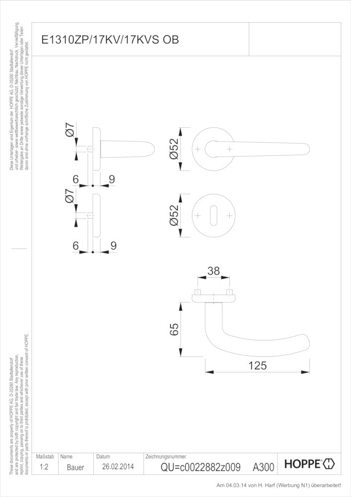 | Durchmesser Schlüsselrosette: | 52.00 MMT |