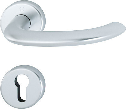 Drückergarnitur Marseille 1138/42KV/42KVS; Produkttyp: Drückergarnitur; Produkttyp (Hersteller): Drückergarnitur; Ausführung: Rosette; Befestigungsart Drückerrosette (außen): verdeckt verschraubt; Befestigungsart Drückerrosette (innen): verdeckt verschraubt; Befestigungsart Schlüsselrosette (außen): verdeckt verschraubt; Befestigungsart Schlüsselrosette (innen): verdeckt verschraubt; Befestigungstechnik: mit Stütznocken; Montageart: aufliegend; Form Drückerrosette: rund; Form Schlüsselrosette (außen): rund; Form Schlüsselrosette (innen): rund; Vierkant: 8 mm; Material: Aluminium; Form Türgriff (innen): gebogen; Form Türgriff (außen): gebogen; Durchmesser Schlüsselrosette: 52 mm; Länge Türgriff (innen): 147 mm; Länge Türgriff (außen): 147 mm; Höhe Türgriff (innen): 69 mm; Höhe Türgriff (außen): 69 mm; Durchmesser Drückerrosette (außen): 52 mm; Durchmesser Drückerrosette (innen): 52 mm; Höhe Drückerrosette (außen): 9 mm; Höhe Drückerrosette (innen): 9 mm; Höhe Schlüsselrosette (außen): 9 mm; Höhe Schlüsselrosette (innen): 9 mm; Lagerung: wartungsfreies Gleitlager,mit Rückholfeder; Einsatzbereich: Zimmertür; Türart: Vollblatt; Türwerkstoff: Holz,Stahl; Lochung: Profilzylinder gelocht; DIN-Richtung: DIN Links-Rechts; Farbe: silber; Farbton: naturfarben; Oberfläche: eloxiert; Ausführung Vierkant: Vierkantstift; Türstärke: 42 mm; Türstärke min.: 37 mm; Türstärke max.: 42 mm; Norm: DIN EN 1906; EN 1906 - Gebrauchskategorie: Klasse 3; EN 1906 - Korrosionsbeständigkeit: Klasse 4; Klassifizierungsschlüssel EN 1906: 37-0140A