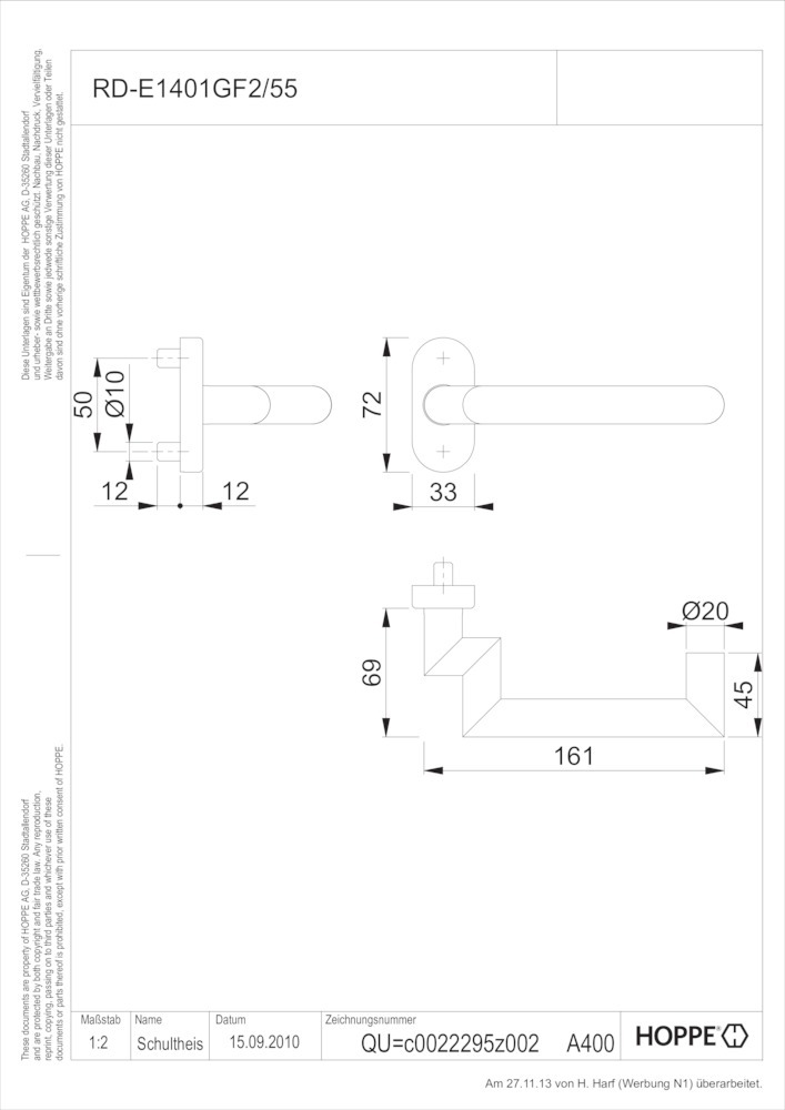 HOPPE®, Feuerhemmend-Drücker-Halbgarnitur, Ausführung: Antipanik, Modell: Rotterdam, Modellnummer: RD-E1401GF2/55, Vierkant: 9 mm, DIN-Richtung: DIN Links-Rechts, Material: Edelstahl, Farbton: edelstahl matt, Anwendung: innen, Befestigungstechnik: mit Stütznocken, Befestigungsart: verdeckt verschraubt, Befestigungssystem: Stiftverbindung,Material Unterkonstruktion : Zamak, Länge: 72 mm, Breite: 33 mm, Form: oval, Lagerung: Gleitlager, wartungsfrei, Rückholfeder, festdrehbar, Anschlagrichtung: Drücker rechts/links verwendbar, Abdeckung: ohne Schlüsselrosette, Drückerbefestigung: Antipanikvollstift, Drückerform: gekröpft, Gehrung, U-Form,Drückerdurchmesser : 20mm,Drückerlänge : 161mm,Drückerhöhe : 69mm, Türstärke min.: 45 mm, Türstärke max.: 65 mm, Stärke Abdeckung: 12 mm, Norm: DIN 18273, DIN EN 179, Zulassung: für Feuerschutz, für Rauchschutz, für Notausgänge, Türart: Innentüren, Fluchttüren, Rahmentüren, Türwerkstoff: Aluminium, Kunststoff