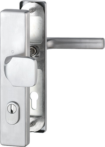 Sicherheits-Wechselgarnitur Dallas FS-E61G/2222ZA/2210/1643F; Produkttyp: Sicherheits-Wechselgarnitur; Produkttyp (Hersteller): Sicherheits-Wechselgarnitur; Ausführung: Langschild; Form: eckig; Zulassung: für Feuerschutz,für Rauchschutz; Material: Edelstahl; Form Türgriff (innen): gerade; Form Türgriff (außen): gekröpft; Ausführung Türgriff (außen): fest; Länge Türgriff (innen): 131 mm; Länge Türgriff (außen): 54 mm; Breite Türgriff (innen): 21 mm; Breite Türgriff (außen): 83 mm; Höhe Türgriff (innen): 55 mm; Höhe Türgriff (außen): 52 mm; Material Unterkonstruktion (innen): Zamak/Stahl; Material Unterkonstruktion (außen): Stahl; Einsatzbereich: Objekttür; Türart: Vollblatt; Türwerkstoff: Stahl,Holz; Zylinderabdeckung: mit Zylinderabdeckung; DIN-Richtung: DIN Links-Rechts; Widerstandsklasse nach DIN 18257: ES 1; Vierkant: 9 mm; Entfernung: 92 mm; Lochung: Profilzylinder gelocht; Ausführung Vierkant: Rollenwechselstift; Farbe: grau; Farbton: edelstahl matt; Schildlänge außen: 249 mm; Schildlänge innen: 249 mm; Schildbreite außen: 53 mm; Schildbreite innen: 53 mm; Schildstärke innen: 10 mm; Schildstärke außen: 15 mm; Zylinderüberstand min.: 10 mm; Zylinderüberstand max.: 18 mm; Türstärke min.: 67 mm; Türstärke max.: 72 mm; Norm: DIN 18273,DIN 18257; EN 1906 - Gebrauchskategorie: Klasse 4; EN 1906 - Korrosionsbeständigkeit: Klasse 4; Klassifizierungsschlüssel EN 1906: 47-D1142U