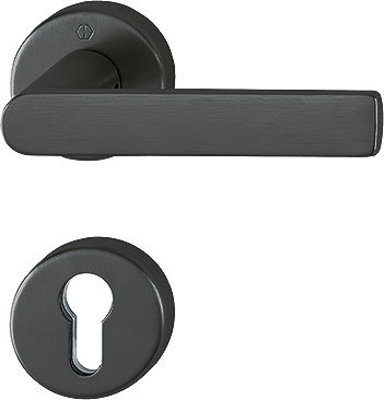 Halbgarnitur Los Angeles M1642/42/42S; Produkttyp: Halbgarnitur; Produkttyp (Hersteller): Halbgarnitur; Ausführung: Rosette; Befestigungsart Drückerrosette (innen): verdeckt verschraubt; Befestigungsart Schlüsselrosette (innen): verdeckt verschraubt; Befestigungstechnik: mit Stütznocken; Montageart: aufliegend; Form Drückerrosette: rund; Form Schlüsselrosette (innen): rund; Vierkant: 8 mm; Material: Messing; Form Türgriff (innen): L-Form; Breite Türgriff (innen): 21 mm; Durchmesser Schlüsselrosette: 52 mm; Länge Türgriff (innen): 122 mm; Höhe Türgriff (innen): 44 mm; Durchmesser Drückerrosette (innen): 52 mm; Höhe Drückerrosette (innen): 9 mm; Höhe Schlüsselrosette (innen): 9 mm; Lagerung: wartungsfreies Gleitlager; Einsatzbereich: Objekttür; Türart: Vollblatt; Türwerkstoff: Stahl,Holz; Lochung: Profilzylinder gelocht; DIN-Richtung: DIN Links-Rechts; Farbe: schwarz; Farbton: schwarz satiniert-Resista®; Ausführung Vierkant: ohne Stift