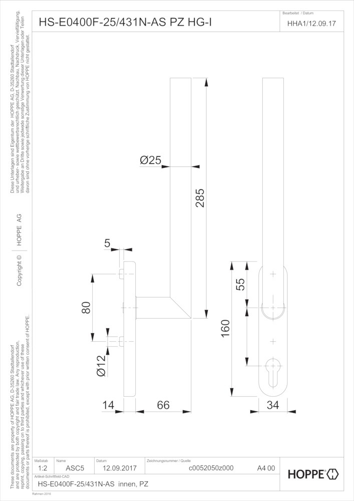 HOPPE Handhebelgarnitur Amsterdam HS-E0400F-25/431N-AS, innen, PZ