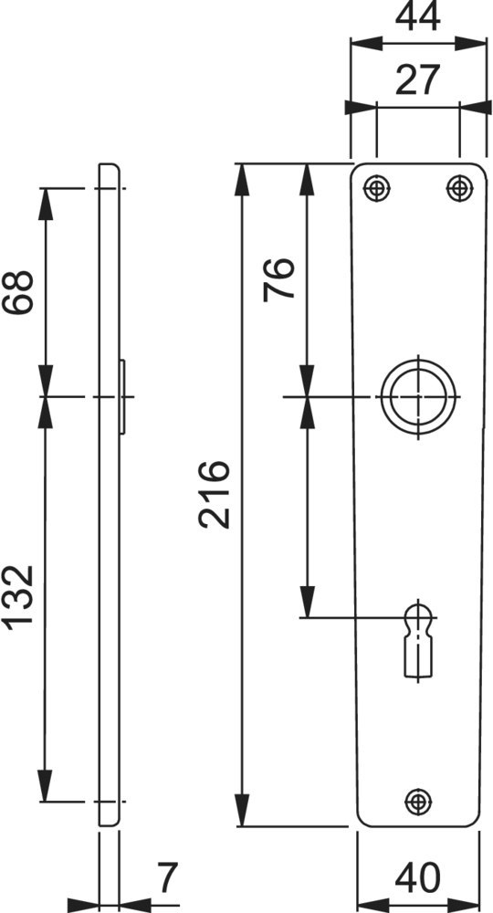 Langschildpaar Frankfurt 201PI; Produkttyp: Langschildpaar; Produkttyp (Hersteller): Langschildpaar; Form: eckig; Befestigungsart: sichtbar verschraubt; Anwendung: außen/innen; Material: Aluminium; Länge: 216 mm; Breite: 44 mm; Höhe: 7 mm; Befestigungsabstand: 200 mm; Türart: Vollblatt; Einsatzbereich: Tür; Ausführung: für Türdrücker; Stütznocken: ohne Stütznocken; Farbe: silber; Farbton: neusilberfarben; Oberfläche: eloxiert; Lochung: Buntbart gelocht; Entfernung: 72 mm; Durchmesser Drückerführung: 18 mm; Lagerung: Gleitlager