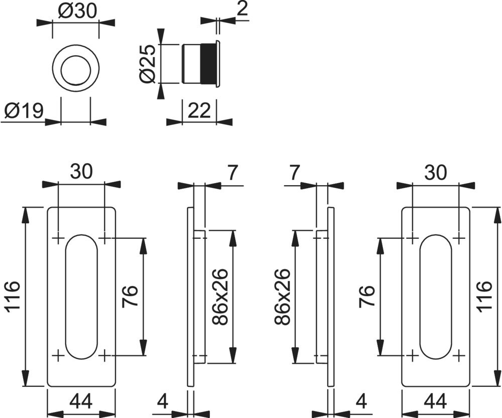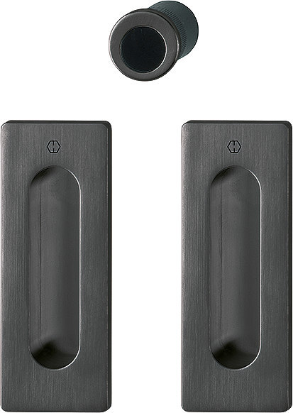 Muschelgriff Set 5 M464; Produkttyp: Muschelgriff; Produkttyp (Hersteller): Schiebetürmuschel; Form: eckig; Material: Messing; Befestigungsart: verdeckt verschraubt; Länge: 116 mm; Breite: 44 mm; Höhe: 11 mm; Einlasslänge: 86 mm; Einlassbreite: 26 mm; Einlasstiefe: 8 mm; Höhe Auflage/Blende: 4 mm; Einsatzbereich: Schiebetür; Türart: Vollblatt; Türwerkstoff: Holz; Ausführung: Set,mit Fingerhülse; Farbe: schwarz; Farbton: schwarz satiniert-Resista®; DIN-Richtung: DIN Links-Rechts; Lochung: ungelocht; Befestigungsabstand (Breite): 30 mm; Befestigungsabstand (Länge): 76 mm; Türstärke min.: 33 mm