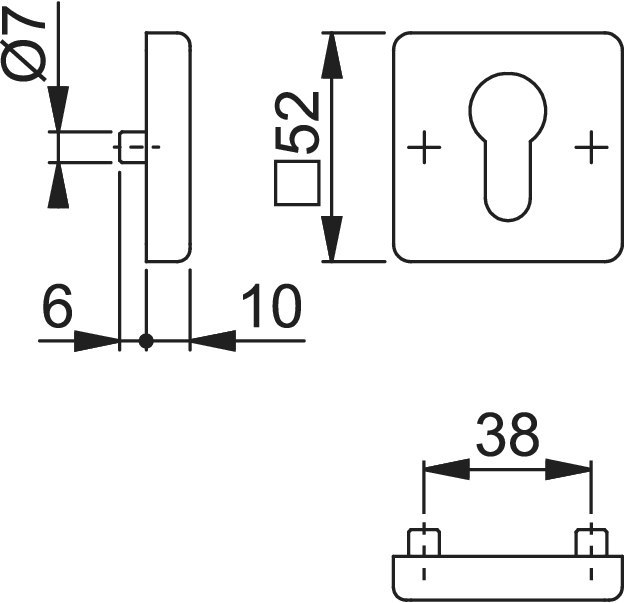 Schlüsselrosette 52S; Produkttyp: Schlüsselrosette; Produkttyp (Hersteller): Schlüsselrosette; Anwendung: außen/innen; Form: eckig; Befestigungsart: verdeckt verschraubt; Material: Aluminium; Länge: 52 mm; Breite: 52 mm; Material Unterkonstruktion: Stahl; Einsatzbereich: Tür; Türart: Vollblatt; Lochung: Profilzylinder gelocht; Farbe: silber; Farbton: naturfarben; Oberfläche: eloxiert; Stütznocken: mit Stütznocken; Höhe: 9 mm