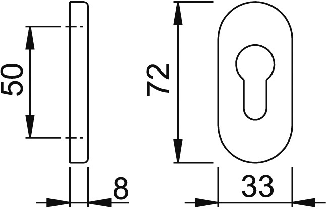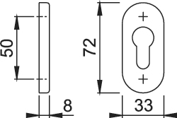 HOPPE®, Profiltür-Schlüsselrosette, Lochung: Profilzylinder gelocht, Befestigungsart: verdeckt verschraubt, Modellnummer: E55S, Material: Edelstahl, Farbton: edelstahl matt, Form: oval, DIN-Richtung: DIN Links-Rechts, Befestigungstechnik: ohne Stütznocken, Länge: 72 mm, Breite: 33 mm, Stärke Abdeckung: 8 mm, Schraublochabstand: 50mm, Türart: Außentüren, Rahmentüren, Türwerkstoff: Aluminium, Kunststoff,Material Unterkonstruktion : Zamak