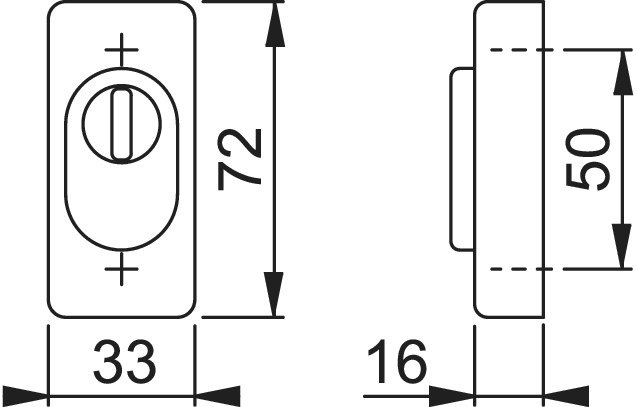 Schutzrosette 44S-ZA; Produkttyp: Schutzrosette; Produkttyp (Hersteller): Schutzrosette; Ausführung: ohne Stütznocken; Form: eckig; Material: Aluminium; Montageart: aufliegend; Befestigungsart: verdeckt verschraubt; Länge Rosette (außen): 72 mm; Breite Rosette (außen): 33 mm; Befestigungsabstand: 50 mm; Einsatzbereich: Haustür; Türart: Rohrrahmen; Türwerkstoff: Aluminium,Kunststoff; Zylinderabdeckung: mit Zylinderabdeckung; Lochung: Profilzylinder gelocht; Farbe: weiß; Farbton: verkehrsweiß; Oberfläche: beschichtet; Höhe Rosette (außen): 16 mm
