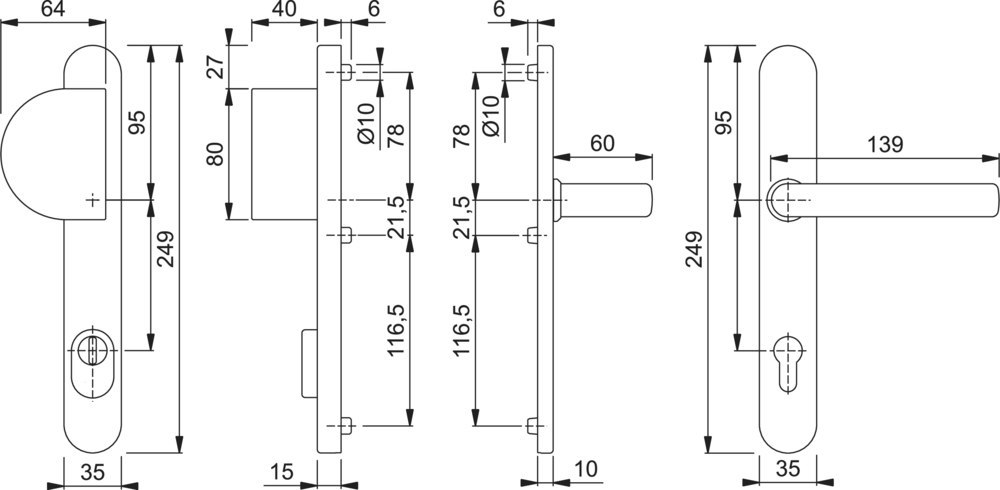 Sicherheits-Wechselgarnitur Liverpool E554/3359ZA/3357N/1313G; Produkttyp: Sicherheits-Wechselgarnitur; Produkttyp (Hersteller): Sicherheits-Wechselgarnitur; Ausführung: Langschild; Form: oval; Material: Edelstahl; Form Türgriff (innen): U-Form,gekröpft; Form Türgriff (außen): Griffplatte,halbrund; Ausführung Türgriff (außen): fest; Länge Türgriff (innen): 139 mm; Länge Türgriff (außen): 80 mm; Breite Türgriff (außen): 64 mm; Höhe Türgriff (innen): 60 mm; Höhe Türgriff (außen): 40 mm; Material Unterkonstruktion (innen): Zamak; Material Unterkonstruktion (außen): Stahl; Einsatzbereich: Haustür; Türart: Rohrrahmen; Türwerkstoff: Kunststoff,Aluminium; Zylinderabdeckung: mit Zylinderabdeckung; DIN-Richtung: DIN Links-Rechts; Widerstandsklasse nach DIN 18257: ES 1; Vierkant: 8 mm; Entfernung: 92 mm; Lochung: Profilzylinder gelocht; Ausführung Vierkant: Vierkantvollstift; Farbe: grau; Farbton: edelstahl matt; Schildlänge außen: 249 mm; Schildlänge innen: 249 mm; Schildbreite außen: 35 mm; Schildbreite innen: 35 mm; Schildstärke innen: 10 mm; Schildstärke außen: 15 mm; Zylinderüberstand min.: 10 mm; Zylinderüberstand max.: 18 mm; Türstärke min.: 67 mm; Türstärke max.: 72 mm; Norm: DIN 18257