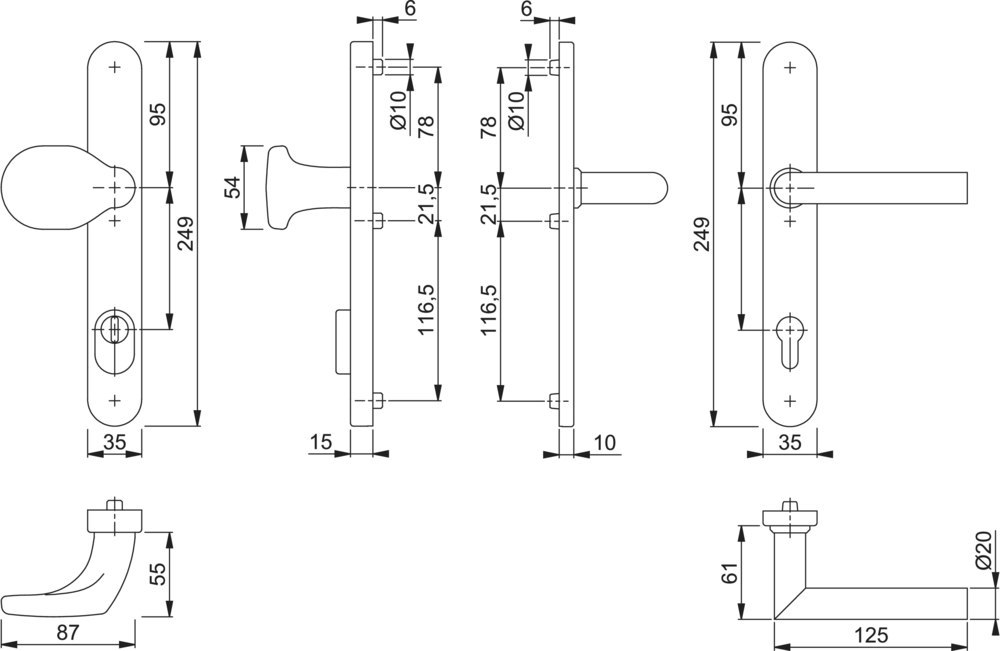 Sicherheits-Wechselgarnitur Amsterdam E86G/3359ZA/3357N/1400F; Produkttyp: Sicherheits-Wechselgarnitur; Produkttyp (Hersteller): Sicherheits-Wechselgarnitur; Ausführung: Langschild; Form: oval; Material: Edelstahl; Form Türgriff (innen): Gehrung; Form Türgriff (außen): gekröpft; Ausführung Türgriff (außen): fest; Länge Türgriff (innen): 125 mm; Länge Türgriff (außen): 53 mm; Breite Türgriff (außen): 87 mm; Höhe Türgriff (innen): 61 mm; Höhe Türgriff (außen): 55 mm; Durchmesser Türgriff (innen): 20 mm; Material Unterkonstruktion (innen): Zamak; Material Unterkonstruktion (außen): Stahl; Einsatzbereich: Haustür; Türart: Rohrrahmen; Türwerkstoff: Aluminium,Kunststoff; Zylinderabdeckung: mit Zylinderabdeckung; DIN-Richtung: DIN Links-Rechts; Widerstandsklasse nach DIN 18257: ES 1; Vierkant: 8 mm; Entfernung: 92 mm; Lochung: Profilzylinder gelocht; Ausführung Vierkant: Rollenwechselstift; Farbe: grau; Farbton: edelstahl matt; Schildlänge außen: 249 mm; Schildlänge innen: 249 mm; Schildbreite außen: 35 mm; Schildbreite innen: 35 mm; Schildstärke innen: 10 mm; Schildstärke außen: 15 mm; Zylinderüberstand min.: 10 mm; Zylinderüberstand max.: 18 mm; Türstärke min.: 67 mm; Türstärke max.: 72 mm; Norm: DIN 18257
