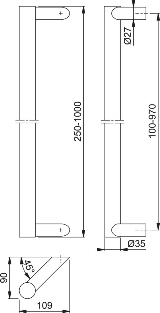 HOPPE Stoßgriff E5062 XL,Befestigungsabstand 100-970,Länge 250-1.000,Durchmesser 35,F69