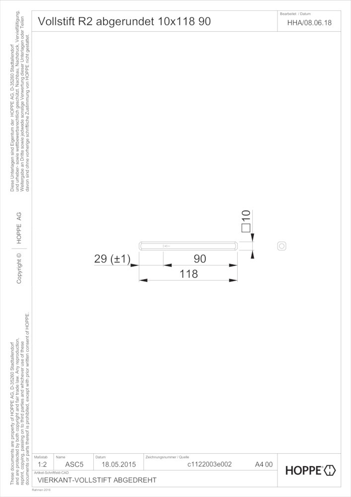 Produktinformationen "HOPPE Vierkantstift R2, 10x118mm verzinkt"