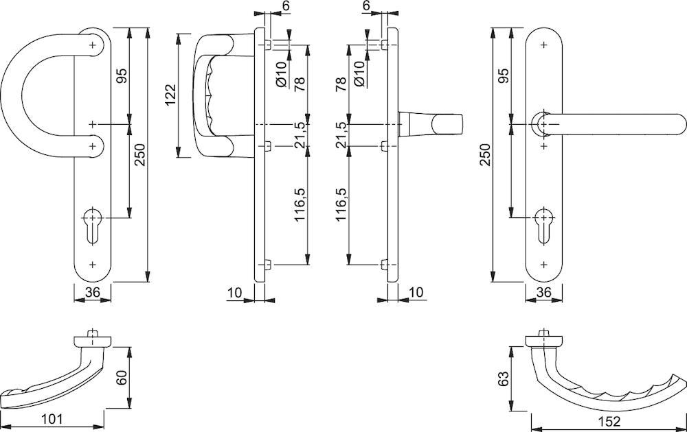 HOPPE®, Profiltür-Wechselgarnitur, Abdeckung: Schmalschild, Modell: Luxembourg, Modellnummer: 513G/3357N/1500, Lochung: Profilzylinder gelocht, Entfernung: 92mm, Vierkant: 8mm, Material: Aluminium, Farbton: natur matt, Oberfläche: eloxiert, DIN-Richtung: DIN Links-Rechts, Lagerung: Gleitlager, wartungsfrei, festdrehbar, Rückholfeder, Befestigungsart: verdeckt verschraubt, Befestigungstechnik: mit Stütznocken,Material Unterkonstruktion : Zamak, Befestigungssystem: Stiftverbindung,Drückerform : gebogen,Drückerlänge : 152mm,Drückerhöhe : 63mm, Eigenschaft: Stoßgriff fest auf Schild, Länge: 250mm, Breite: 36mm, Stoßgriffform: halbrund gebogen, Stoßgrifflänge: 122mm, Stoßgriffbreite: 101mm, Stoßgriffhöhe: 60mm, Anschlagrichtung: Drücker rechts/links verwendbar, Drückerbefestigung: Profilvollstift, Form: oval, Schildstärke außen: 10mm, Schildstärke innen: 10mm, Türstärke min.: 57mm, Türstärke max.: 62mm, Türart: Außentüren, Rahmentüren, Türwerkstoff: Aluminium, Kunststoff