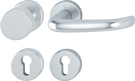 Wechselgarnitur San Francisco 58/42KV/42KVS/1301; Produkttyp: Wechselgarnitur; Produkttyp (Hersteller): Wechselgarnitur; Ausführung: Rosette; Befestigungsart Drückerrosette (außen): verdeckt verschraubt; Befestigungsart Drückerrosette (innen): verdeckt verschraubt; Befestigungsart Schlüsselrosette (außen): verdeckt verschraubt; Befestigungsart Schlüsselrosette (innen): verdeckt verschraubt; Befestigungstechnik: mit Stütznocken; Montageart: aufliegend; Form Drückerrosette: rund; Form Schlüsselrosette (außen): rund; Form Schlüsselrosette (innen): rund; Vierkant: 8 mm; Material: Aluminium; Form Türgriff (innen): gebogen; Form Türgriff (außen): Flachknopf; Ausführung Türgriff (außen): fest; Durchmesser Türgriff (außen): 50 mm; Durchmesser Schlüsselrosette: 52 mm; Länge Türgriff (innen): 137 mm; Höhe Türgriff (innen): 64 mm; Höhe Türgriff (außen): 40 mm; Durchmesser Drückerrosette (außen): 52 mm; Durchmesser Drückerrosette (innen): 52 mm; Höhe Drückerrosette (außen): 9 mm; Höhe Drückerrosette (innen): 9 mm; Höhe Schlüsselrosette (außen): 9 mm; Höhe Schlüsselrosette (innen): 9 mm; Lagerung: mit Rückholfeder,wartungsfreies Gleitlager; Einsatzbereich: Objekttür; Türart: Vollblatt; Türwerkstoff: Holz,Stahl; Lochung: Profilzylinder gelocht; DIN-Richtung: DIN Links-Rechts; Farbe: silber; Farbton: naturfarben; Oberfläche: eloxiert; Ausführung Vierkant: Vierkantstift; Türstärke min.: 37 mm; Türstärke max.: 42 mm; Norm: DIN EN 1906; EN 1906 - Gebrauchskategorie: Klasse 3; EN 1906 - Korrosionsbeständigkeit: Klasse 4; Klassifizierungsschlüssel EN 1906: 37-0140A